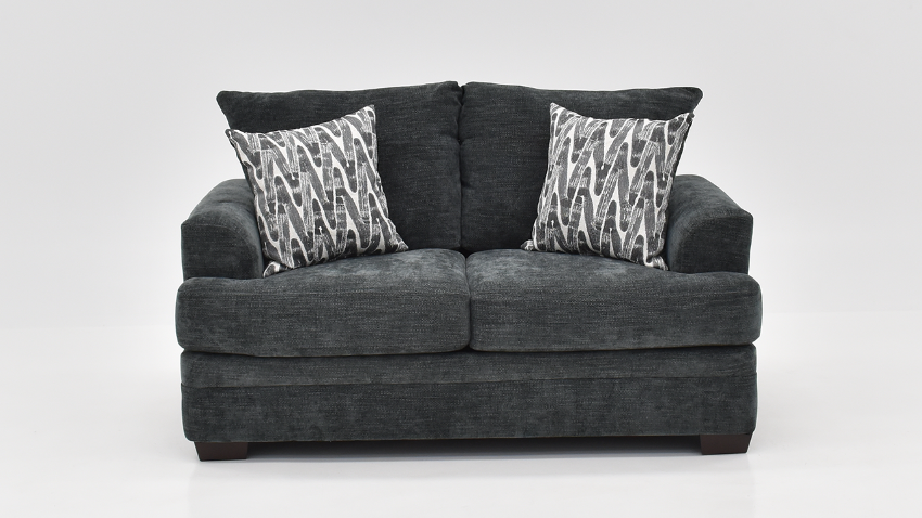 The soft gray Aden Loveseat from Peak Living Furniture features supportive seating and soft attached back cushions. Additional features include gray microfiber-polyester chenille upholstery that is durable and stain resistant, Low track arms, reversible cushions, decorative accent pillows, and stylish plastic feet.