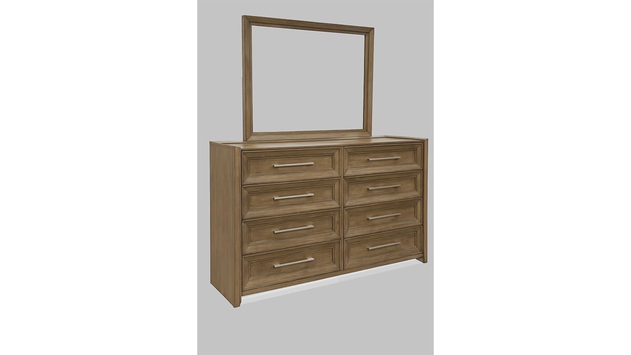 This dresser and mirror set offers a refined balance of beauty and organization. A stepped-edge drawer design and tray-top styling give it a layered, tailored look, while LED lighting beneath the drawers adds an elegant touch. Inside, built-in jewelry trays and thoughtful compartments keep everything in its place.