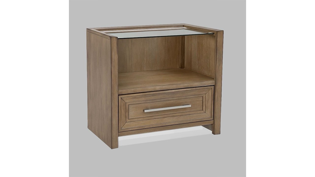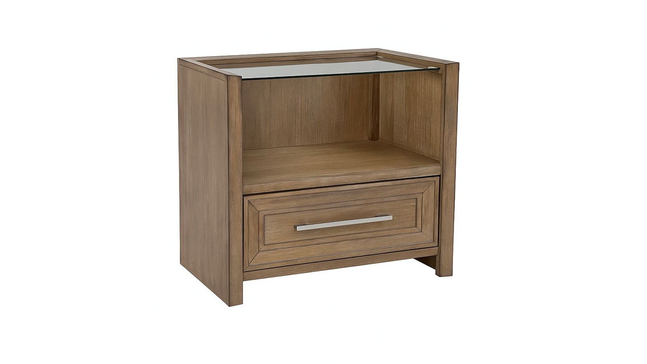 Light and airy in design, this nightstand pairs open shelving with a single drawer and a sleek glass top. LED lighting highlights the lower area, giving your bedside a soft, ambient glow.