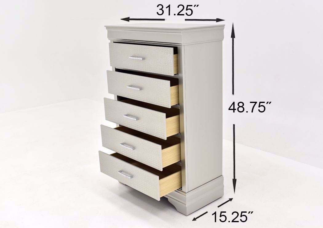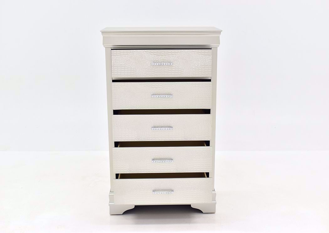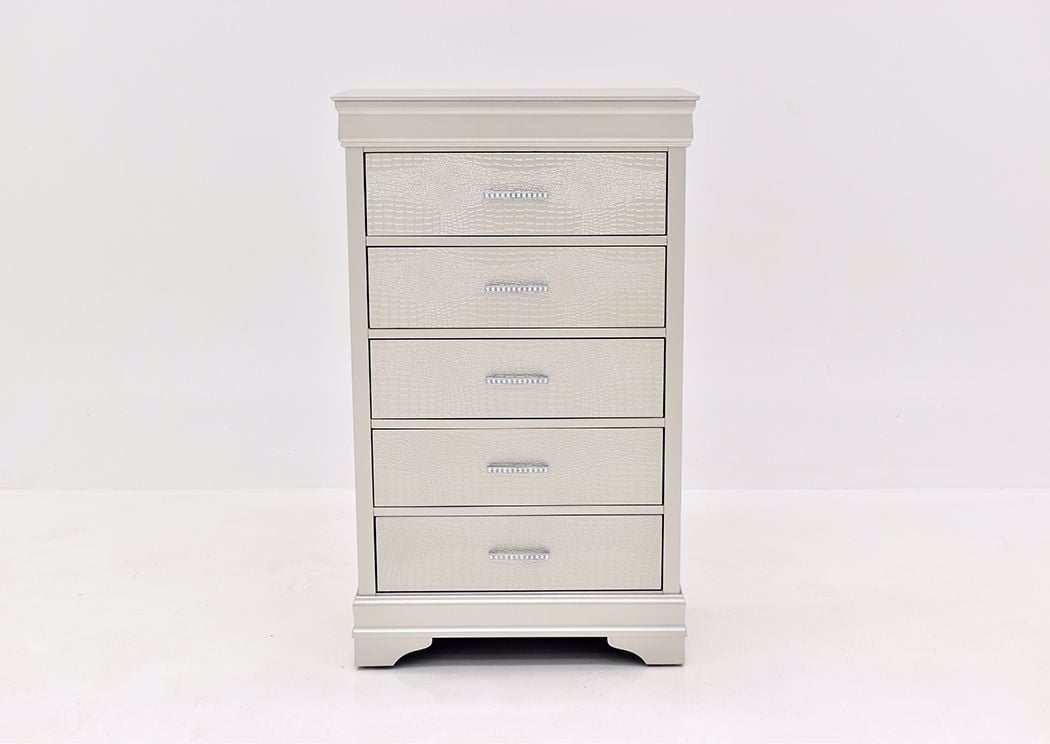 The Amalia Chest in White features an elegant metallic white finish, five spacious drawers with textured fronts, and jewel-embellished pulls for a chic, glamorous touch.