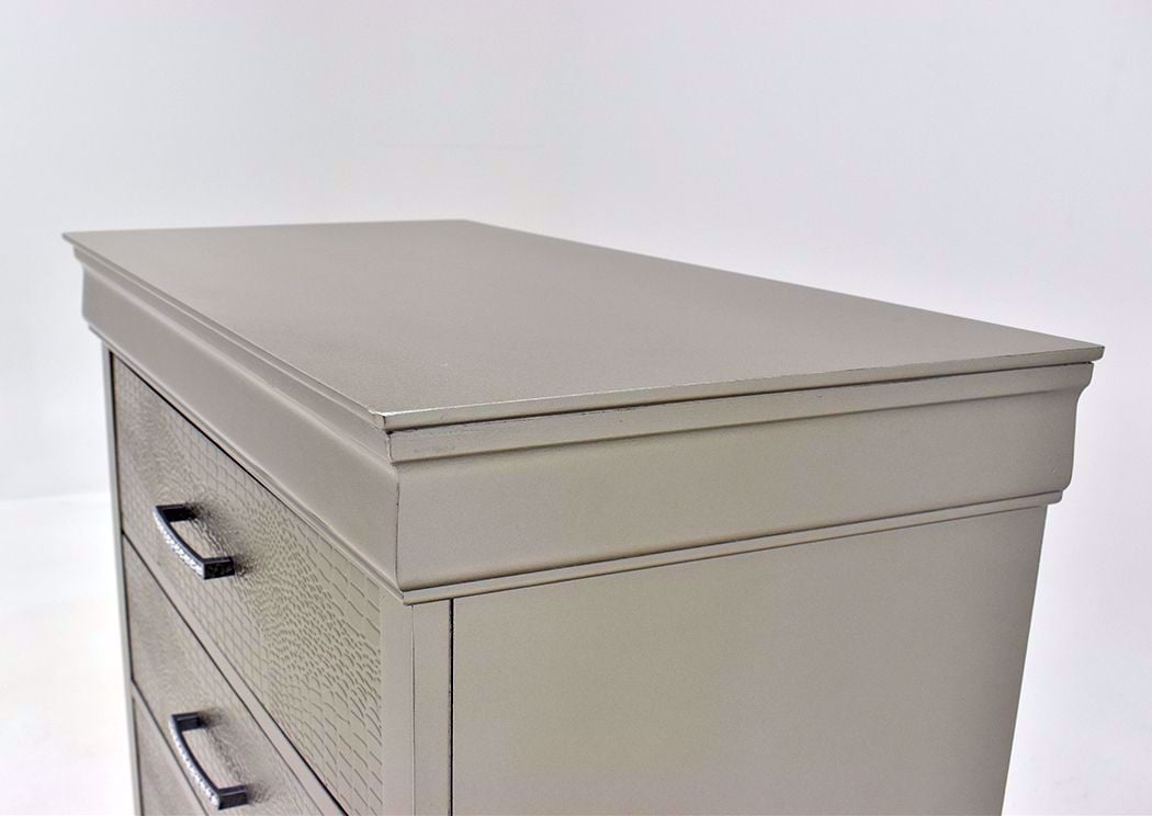 The Amalia Dresser with Mirror in Silver features a chic metallic finish, six spacious textured drawers, a framed mirror, and jewel-embellished pulls for a touch of glam.