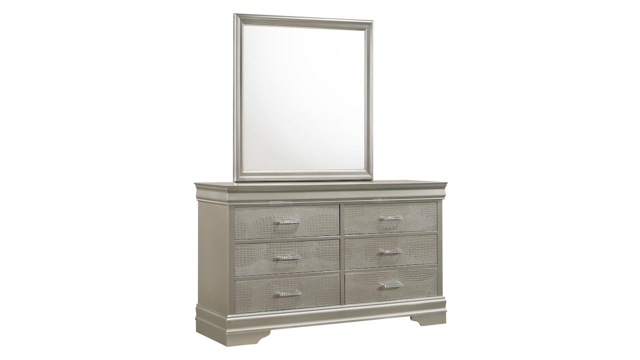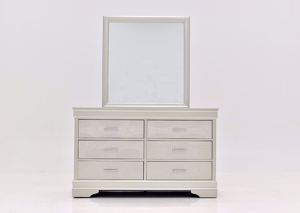 The Amalia Dresser with Mirror in White features a chic metallic white finish, six spacious textured drawers, a framed mirror, and jewel-embellished pulls for a touch of glam.