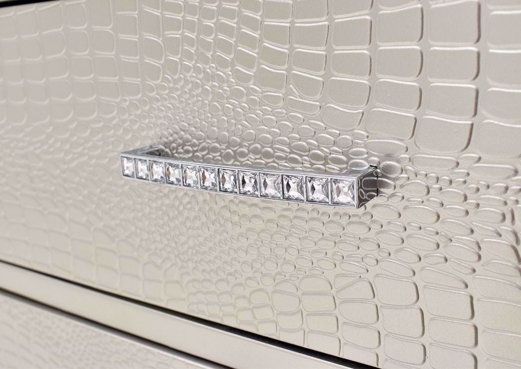 The Amalia Chest in White features an elegant metallic white finish, five spacious drawers with textured fronts, and jewel-embellished pulls for a chic, glamorous touch.