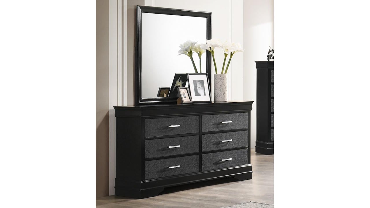 The Amalia Queen Bedroom Set in Black features a black metallic finish, a jewel-embellished upholstered headboard, textured footboard and drawers, plus a dresser with mirror and nightstand for elegant, spacious storage.