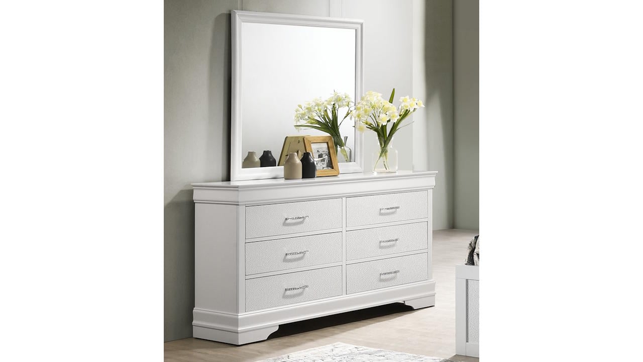 The Amalia Dresser with Mirror in Silver features a chic metallic finish, six spacious textured drawers, a framed mirror, and jewel-embellished pulls for a touch of glam.