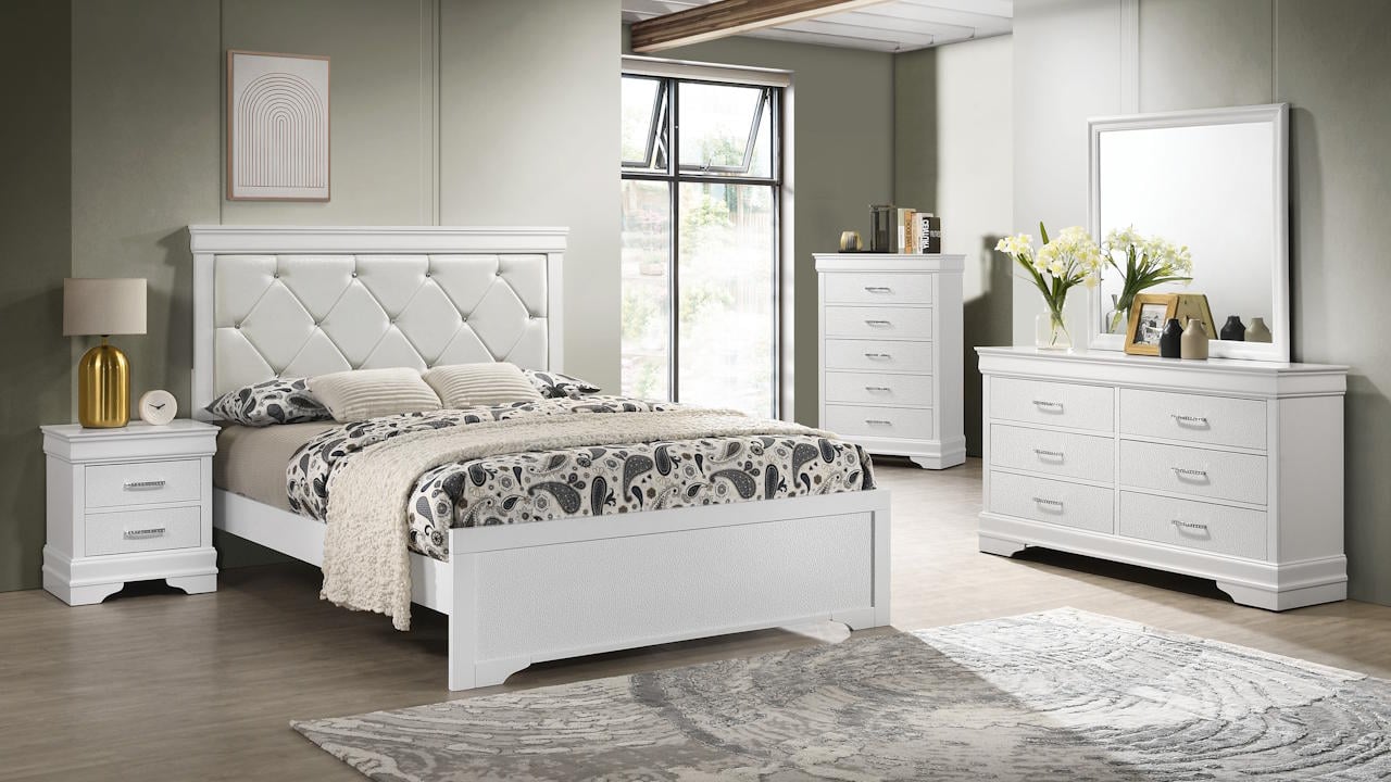 The Amalia Queen Bedroom Set in White features a white metallic finish, a jewel-embellished upholstered headboard, textured footboard and drawers, plus a dresser with mirror and nightstand for elegant, spacious storage.