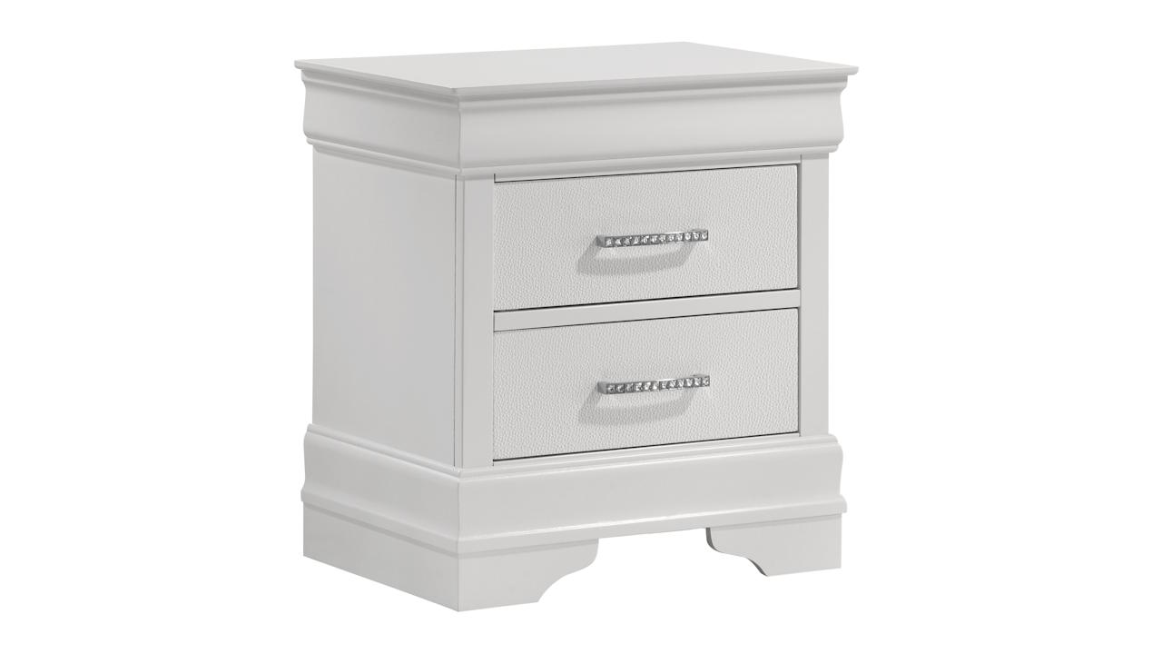 The Amalia Queen Bedroom Set in White features a white metallic finish, a jewel-embellished upholstered headboard, textured footboard and drawers, plus a dresser with mirror and nightstand for elegant, spacious storage.