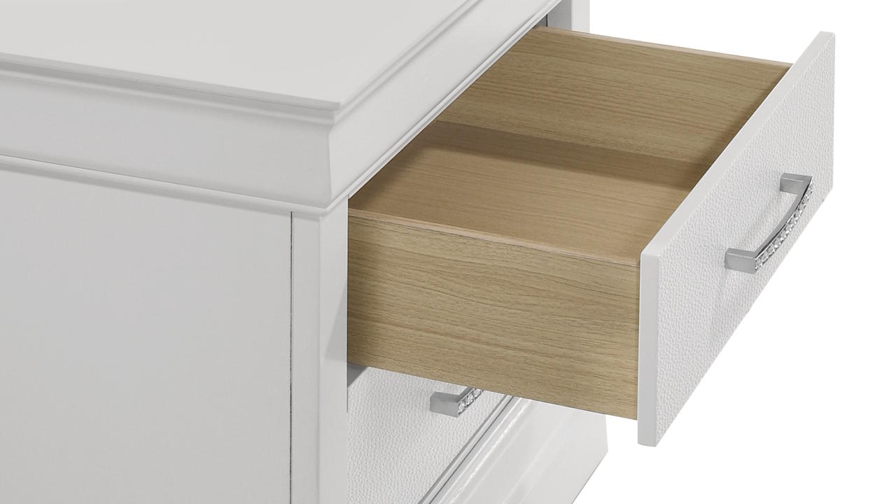 The Amalia Nightstand in Silver features a chic metallic finish, two spacious drawers with textured fronts, and jewel-embellished pulls for a touch of glamour.