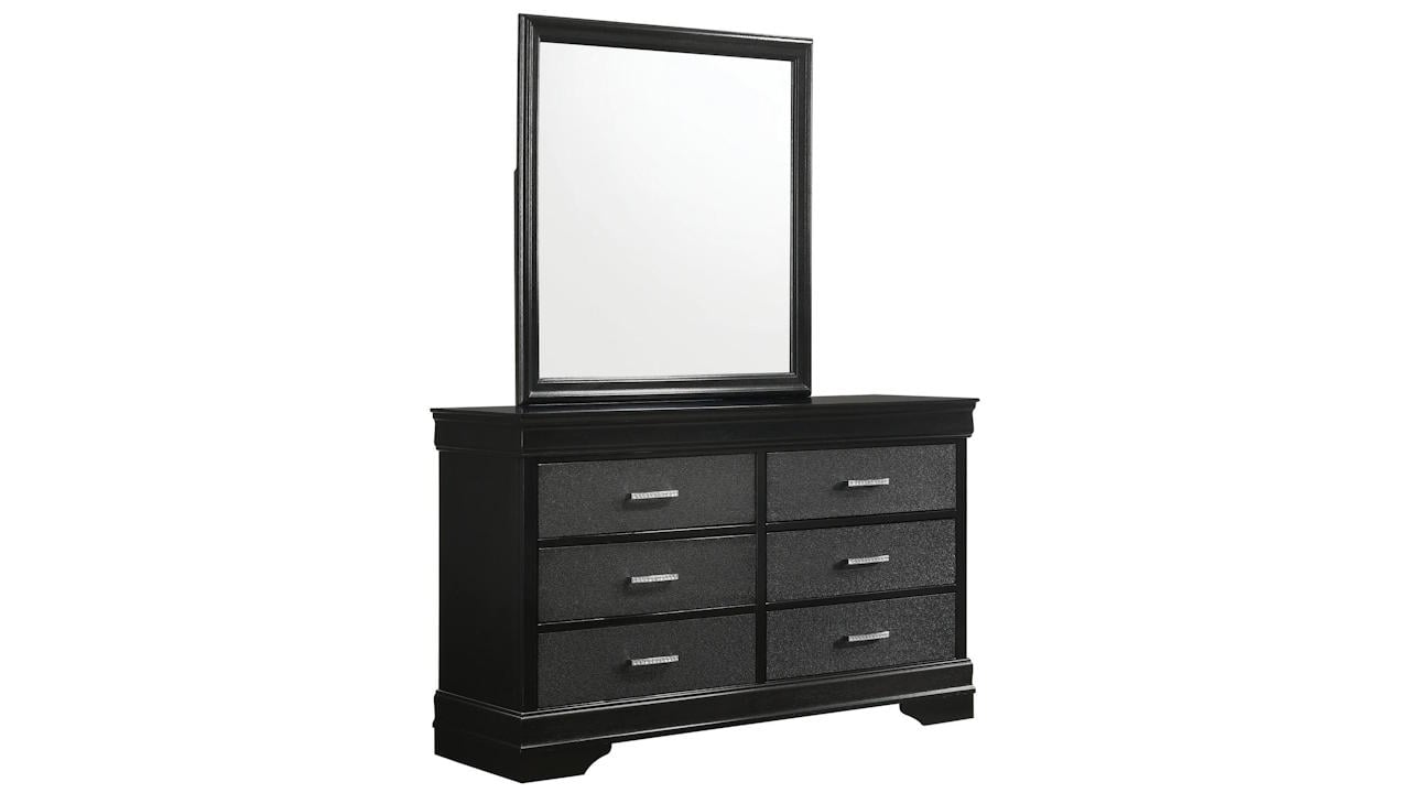 The Amalia Dresser with Mirror in Black features a chic metallic black finish, six spacious textured drawers, a framed mirror, and jewel-embellished pulls for a touch of glam.