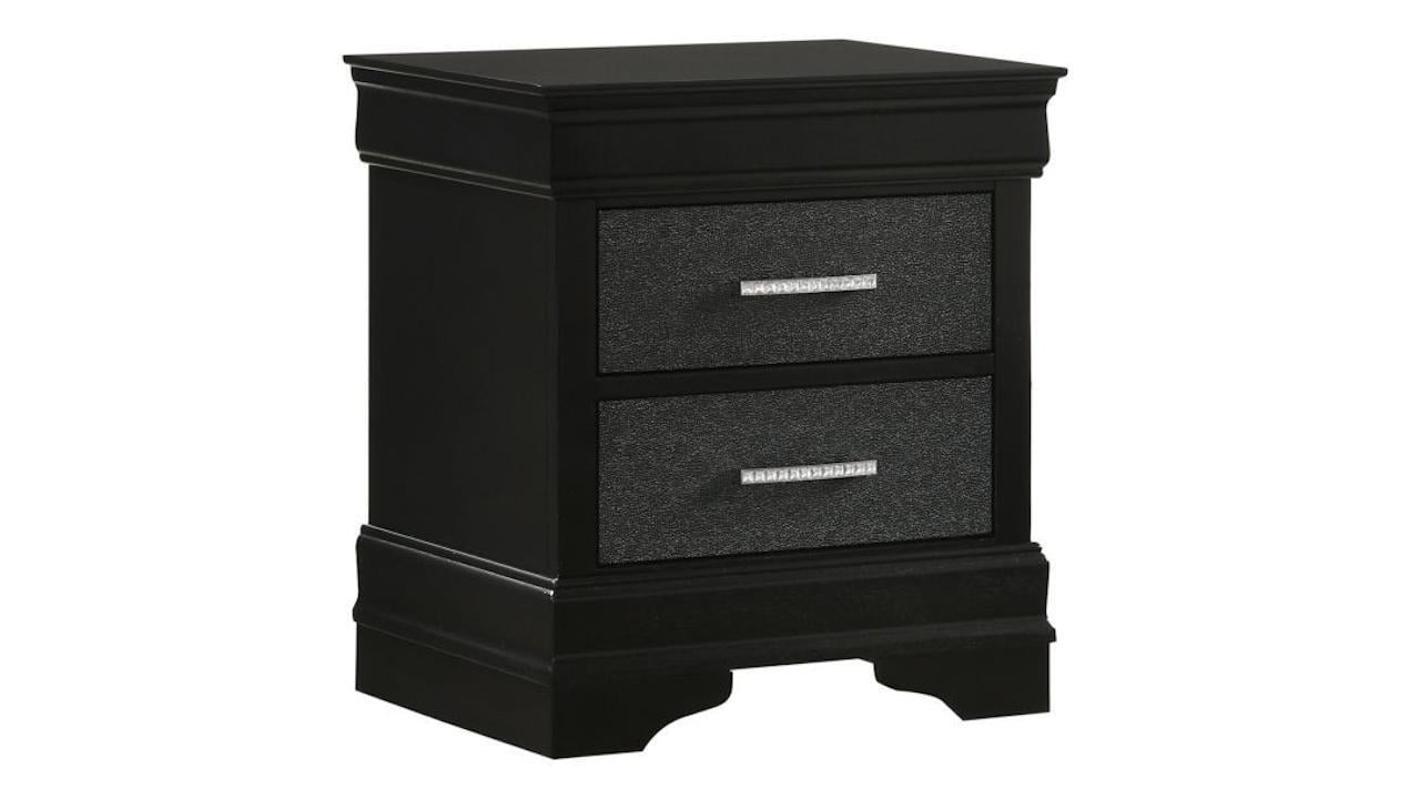 The Amalia Nightstand in Black features a chic metallic black finish, two spacious drawers with textured fronts, and jewel-embellished pulls for a touch of glamour.