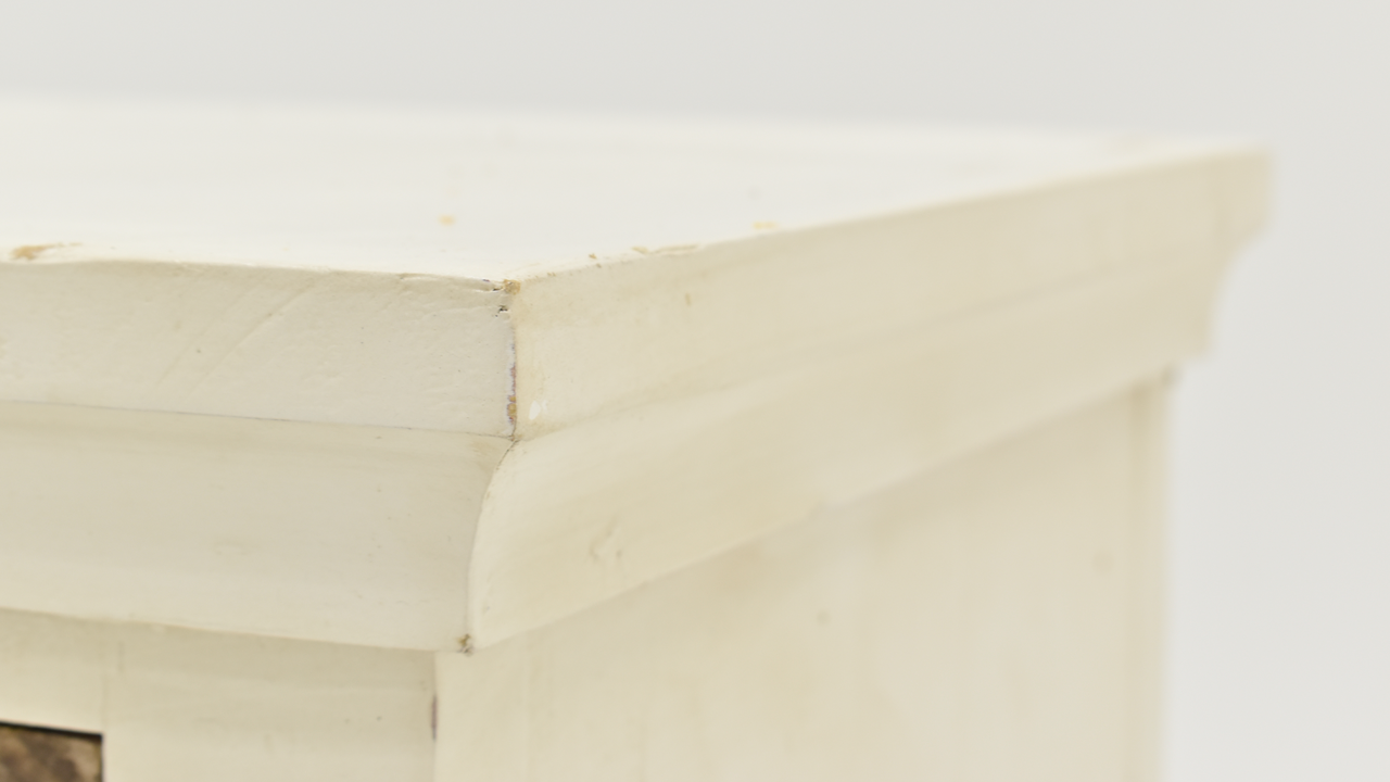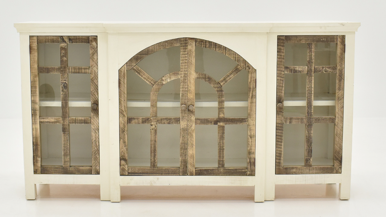 The Arche 4 Door Console Cabinet offers an inviting look into your well-organized decor and accessories. This accent cabinet is a great way to store or display items such as framed photos, office supplies, books, and electronic equipment. You have plenty of storage options with 3 enclosed spaces each with a shelf. This beautiful design is finished in distressed white finish on the base and the doors are finished in a hand-applied and unique application of a light brown. The one-of-a-kind finish is lightly distressed to create a down-to-earth feel that your family and guests are sure to love. Constructed of 100% Brazilian Pine, the Arche 4 Door Console Cabinet will make an excellent TV stand, media center, or storage option for any room in your home or office.