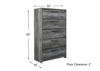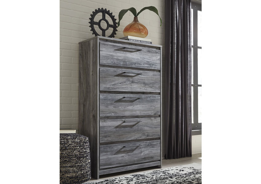 Beachy style and lots of storage go hand in hand with the Baystorm Chest of Drawers by Ashley Furniture. Its driftwood and surfer-inspired smoky finish creates a rustic look that's perfect for setting the scene of an island getaway. Five roomy drawers give you the space needed for stowing away clothes and more. Clean lines and modern handles provide an authentic look to be admired for years to come.