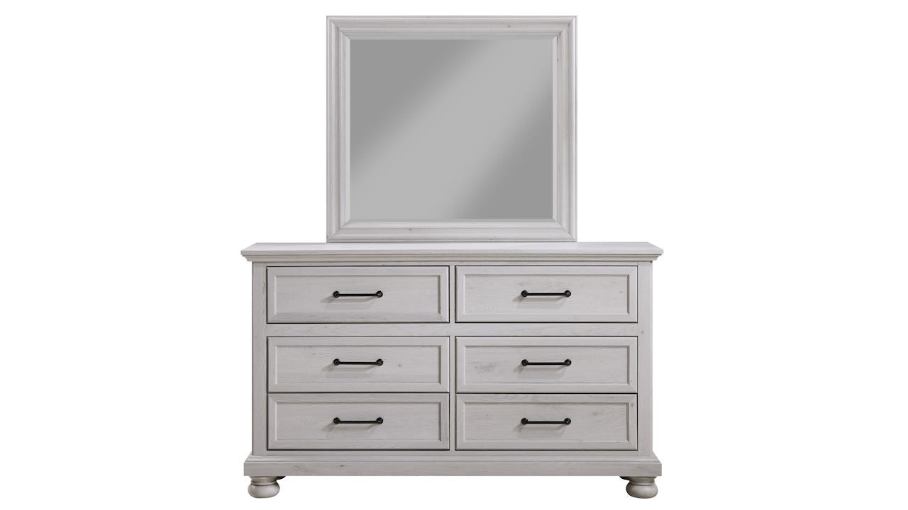 The Bella Dresser with Mirror in Gray features six spacious drawers with black metal handles, a distressed gray finish, a matching framed mirror, and classic bun feet for a timeless and functional bedroom piece.