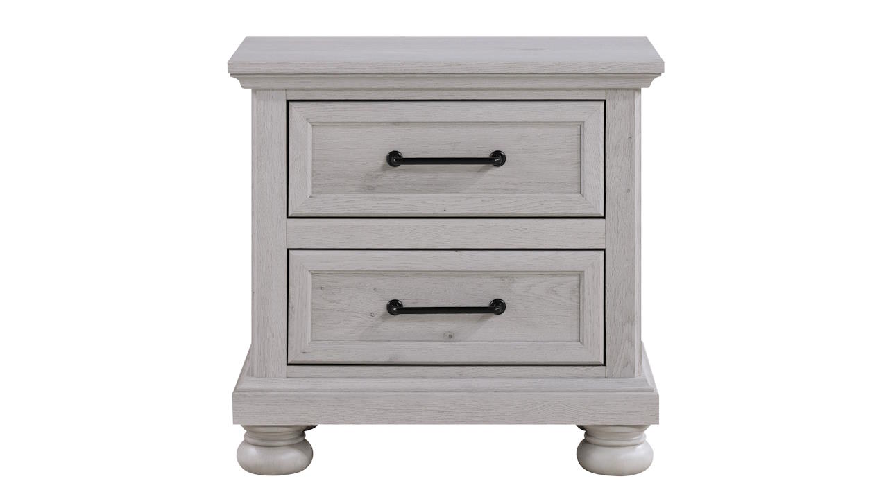 The Bella Nightstand in Gray features a light gray wood finish, beveled-edge drawers with black metal handles, and sturdy bun feet, blending rustic charm with modern elegance.