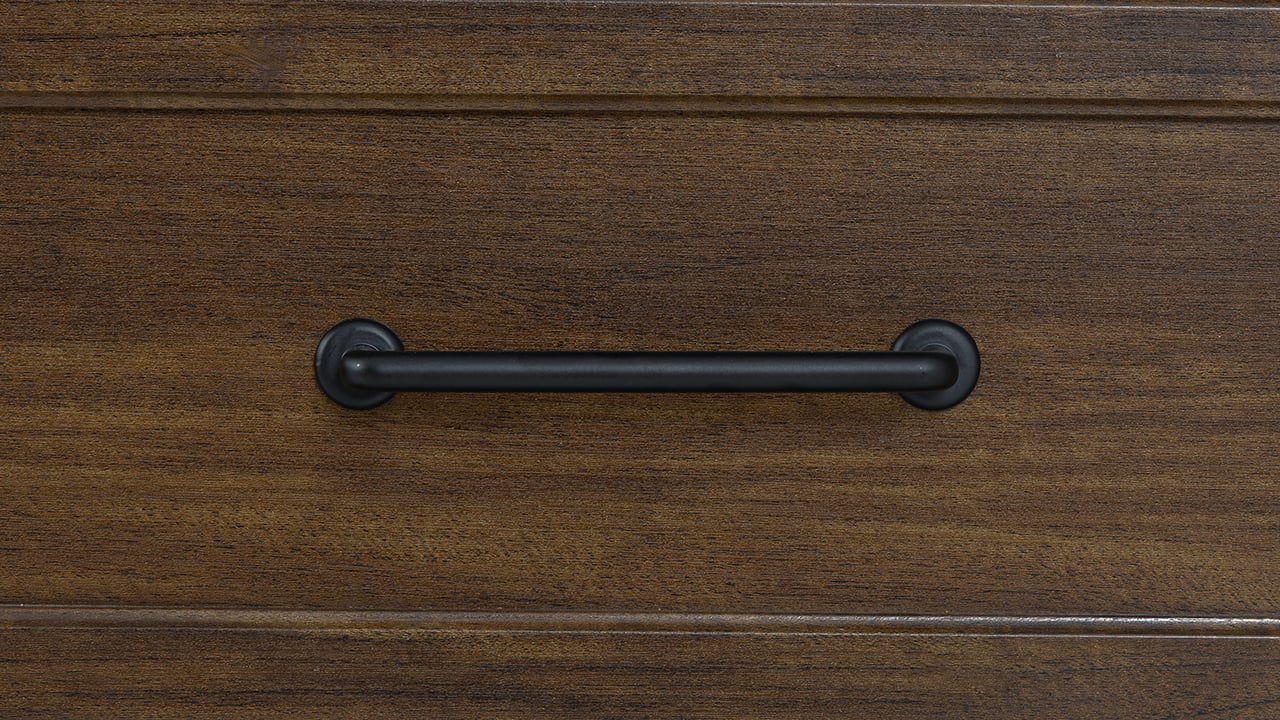 The Bella Chest in Brown blends rustic warmth with modern elegance. Its rich brown finish, beveled-panel drawers, sleek black pulls, and rounded bun feet offer a versatile and functional addition to any bedroom.