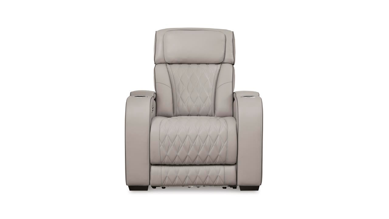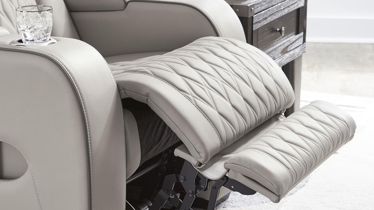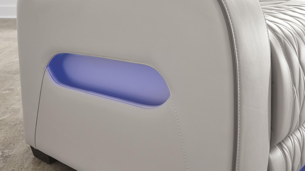 Experience ultimate comfort and luxury with the Boyington Power Reclining Sofa in Gray, featuring air massage, heated seats, adjustable positions, and a tech-savvy drop-down table for an unparalleled relaxation experience.