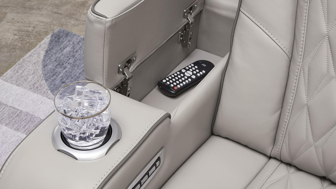 Experience ultimate comfort and luxury with the Boyington Power Reclining Loveseat in Gray, featuring air massage, heated seats, adjustable positions, and a tech-savvy drop-down table for an unparalleled relaxation experience.