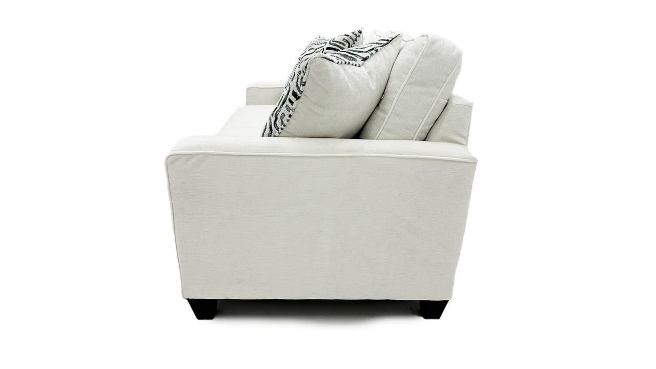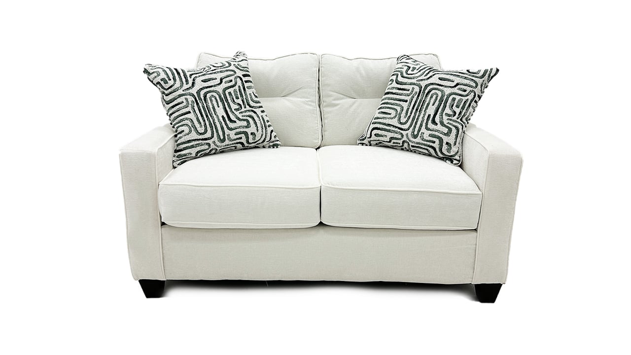 The Braves Loveseat in white features bright white upholstery, tufted backrest, rolled arms, wooden legs, spacious seating, and two matching throw pillows