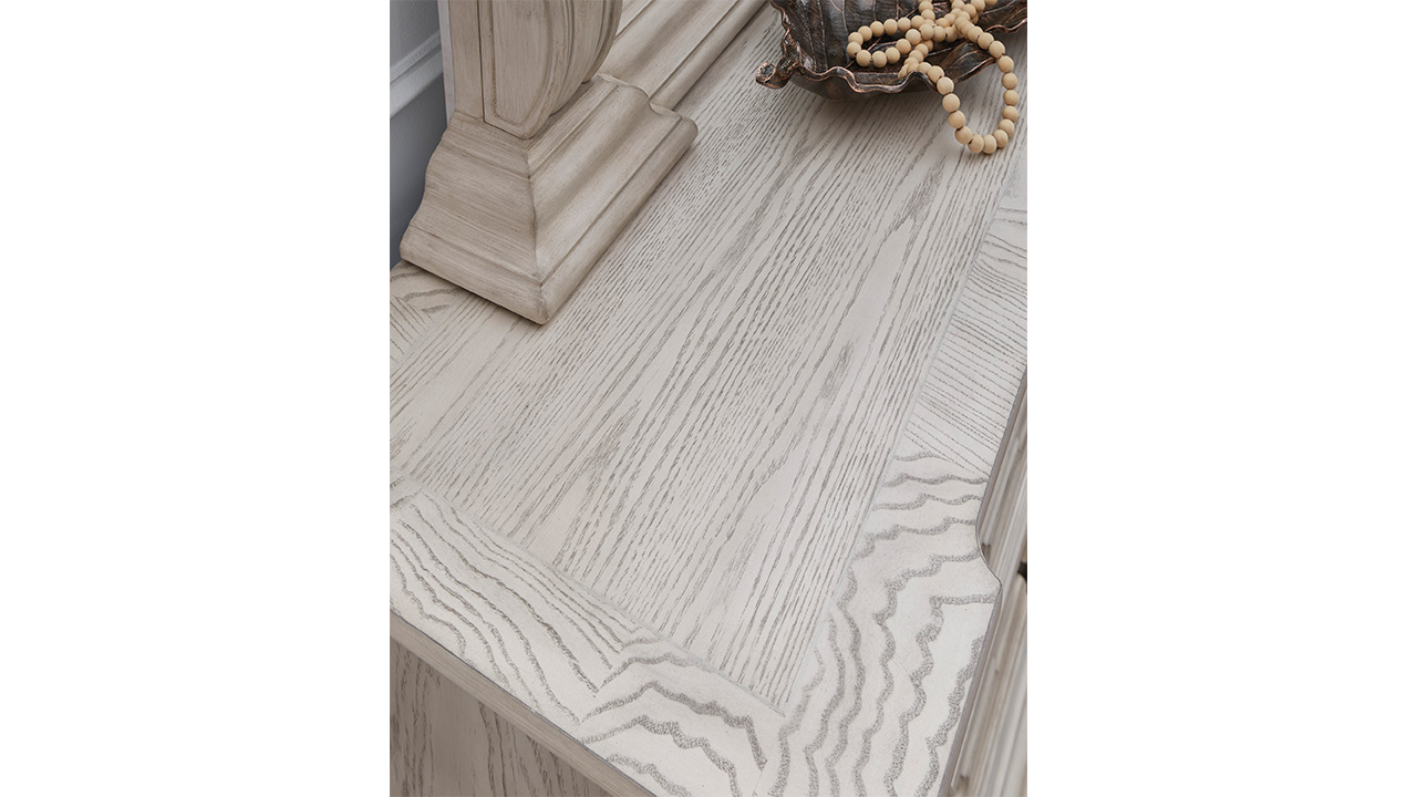 Dresser crafted with hardwood solids, oak and ash swirl veneers, MDF, and cast resin accents
