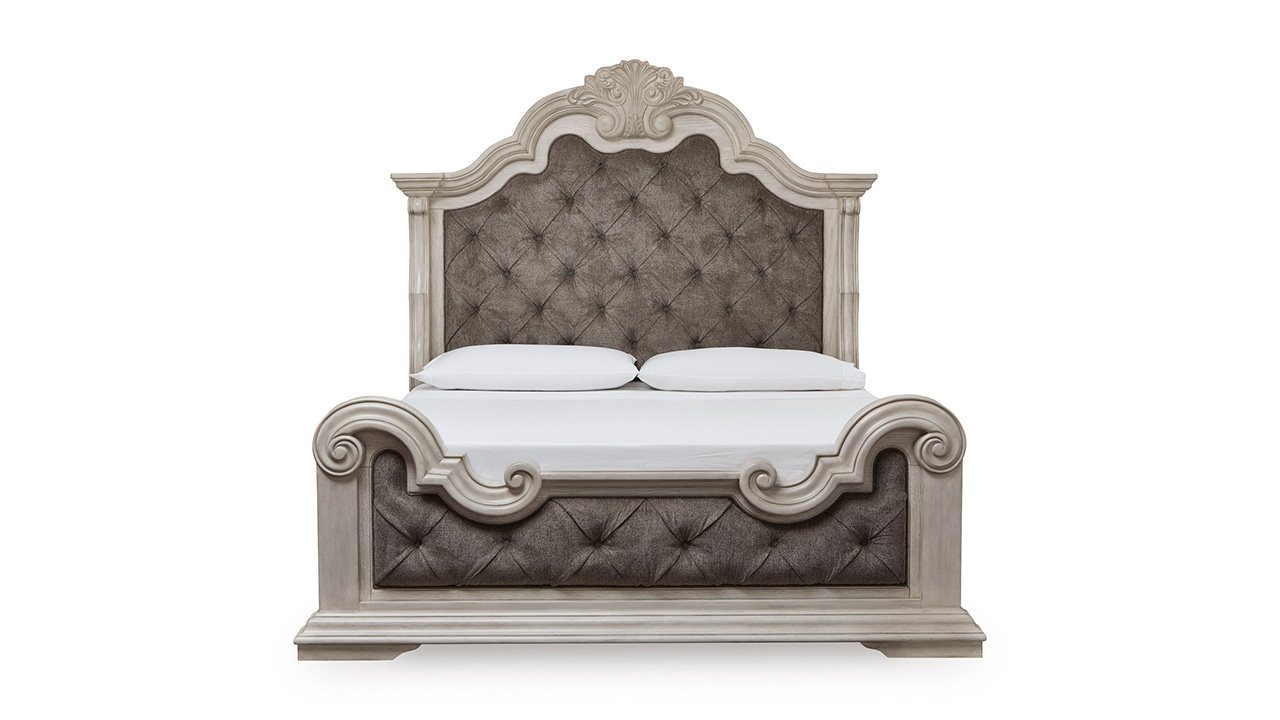 Includes upholstered panel headboard, footboard, rails, and slats
