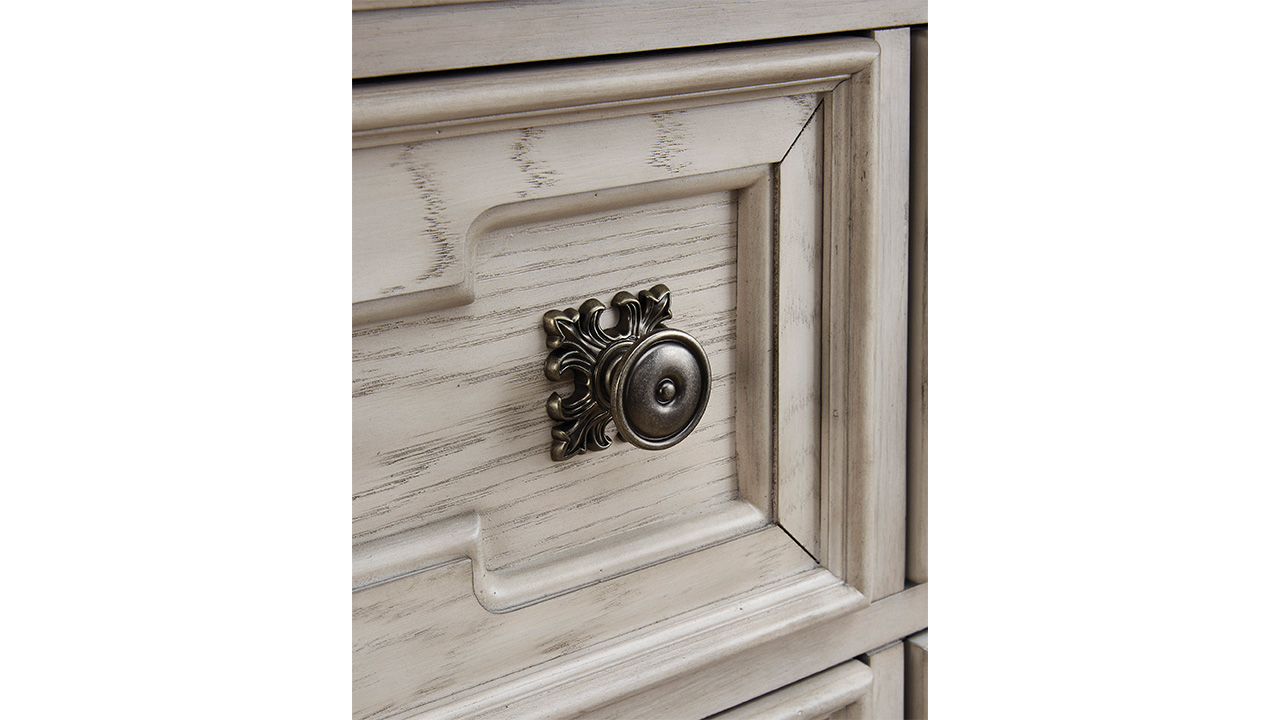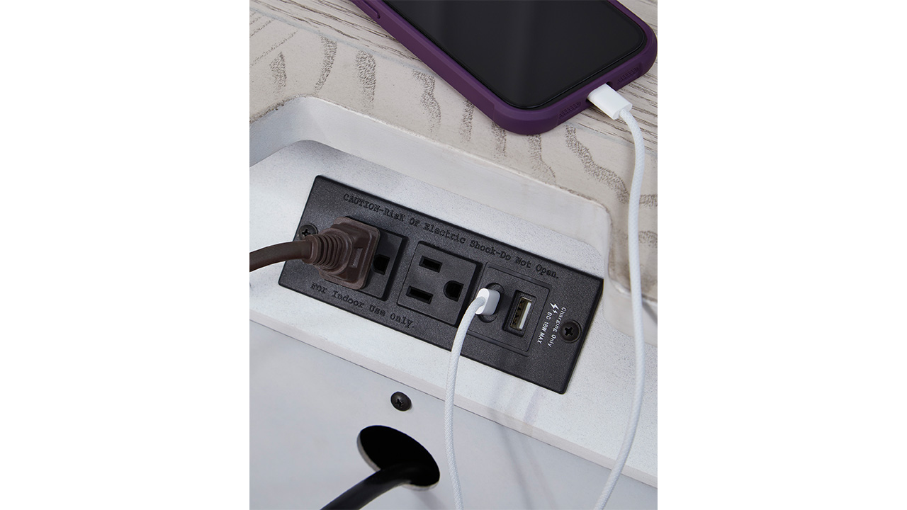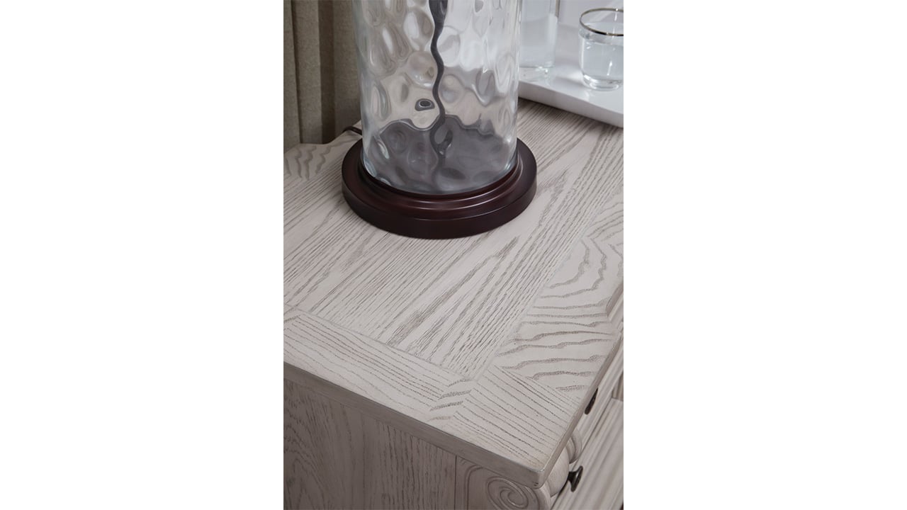 Crafted with hardwood solids, oak and ash swirl veneers, MDF, and cast resin accents
