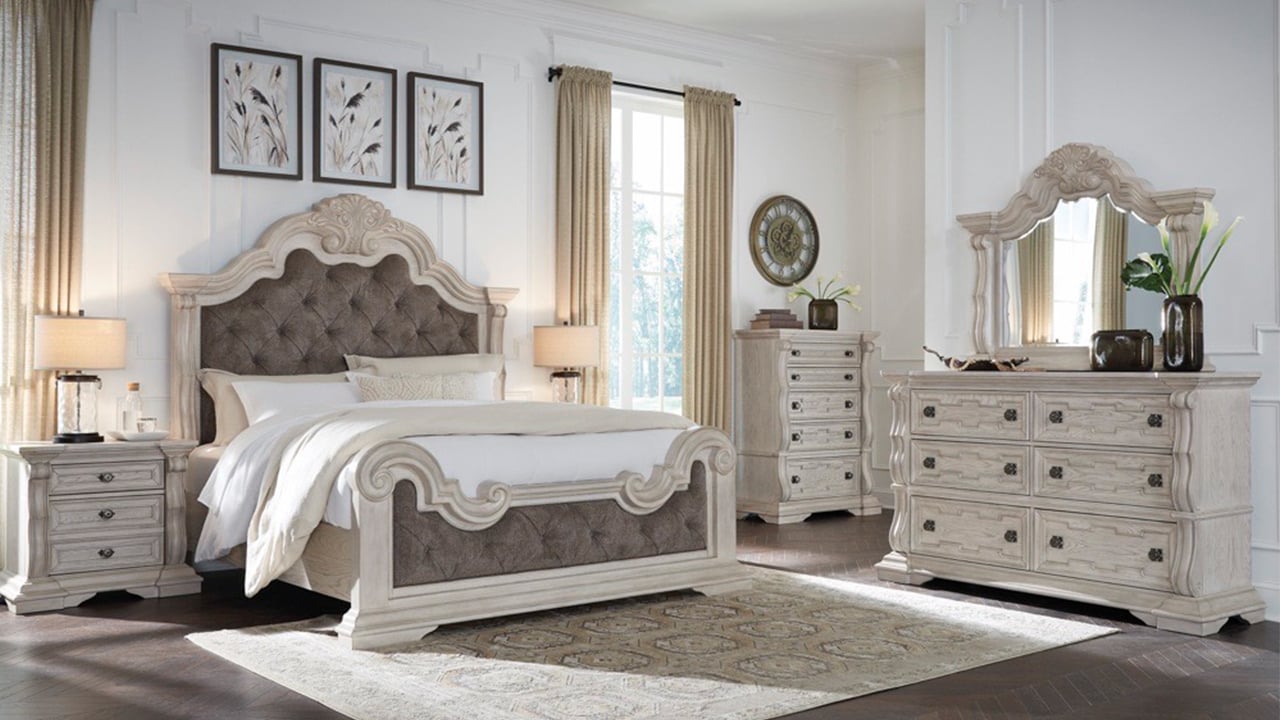 Designed with the grandeur of European traditional style, this king bedroom set brings a beautifully elevated presence to your space. Ornate details, soft upholstery, and a layered antiqued white finish create a serene retreat with a hint of luxury.