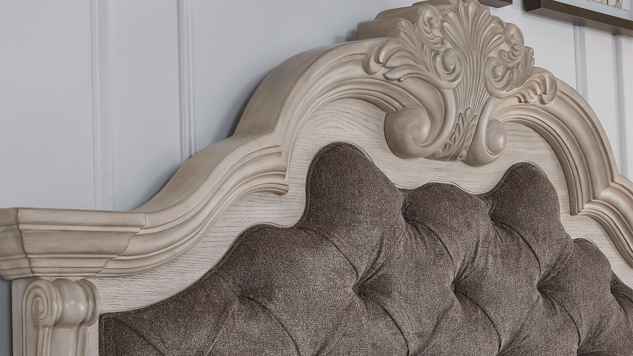 Elevate your bedroom with the timeless elegance of this king upholstered panel bed. Ornate sculpted details and soft button-tufted fabric create a refined, European-inspired look, while the antiqued white finish adds a gentle touch of luxury. Grand in scale yet effortlessly inviting, it becomes the centerpiece of a beautifully serene retreat.