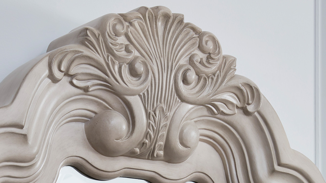 Rooted in classic European elegance, this dresser and mirror set brings a refined, graceful presence to your bedroom. Ornate sculpted details, rich veneer accents, and an antiqued white finish create a timeless look that feels both sophisticated and inviting.