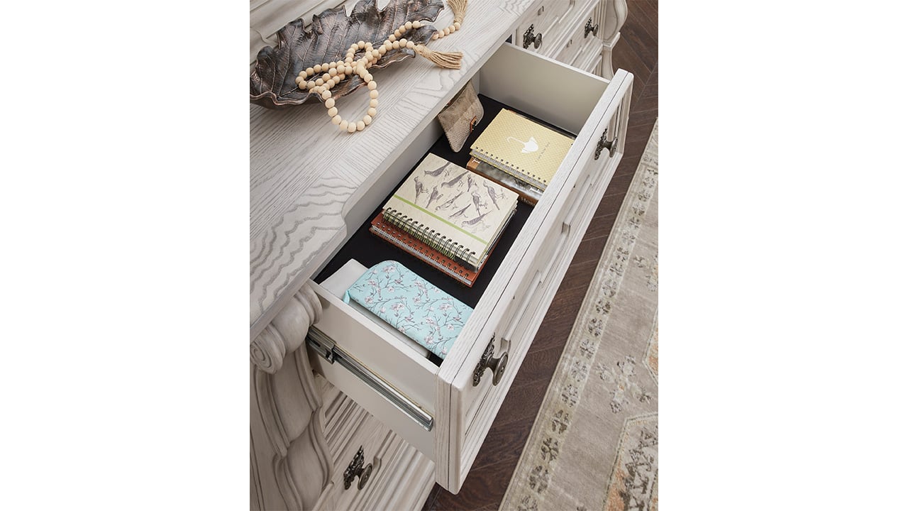 With its classic European-inspired detailing and soft antiqued white finish, this nightstand brings a touch of timeless elegance to your bedside. Sculpted accents, smooth-gliding storage, and a hidden pull-out tray make it as functional as it is refined.