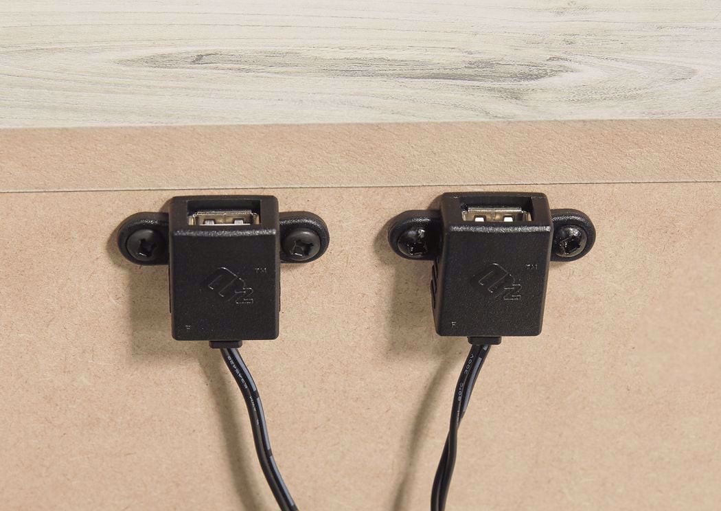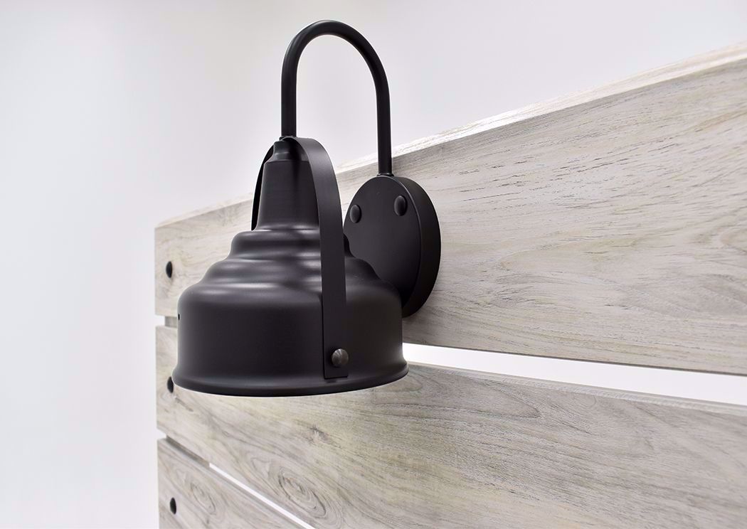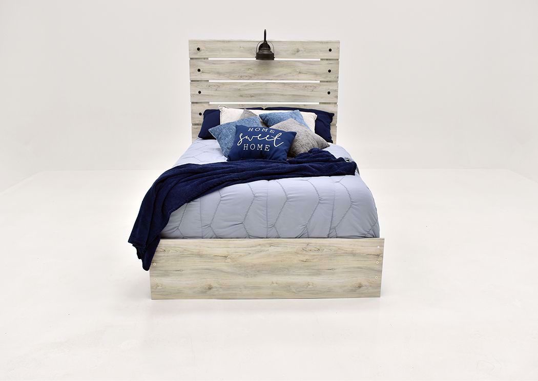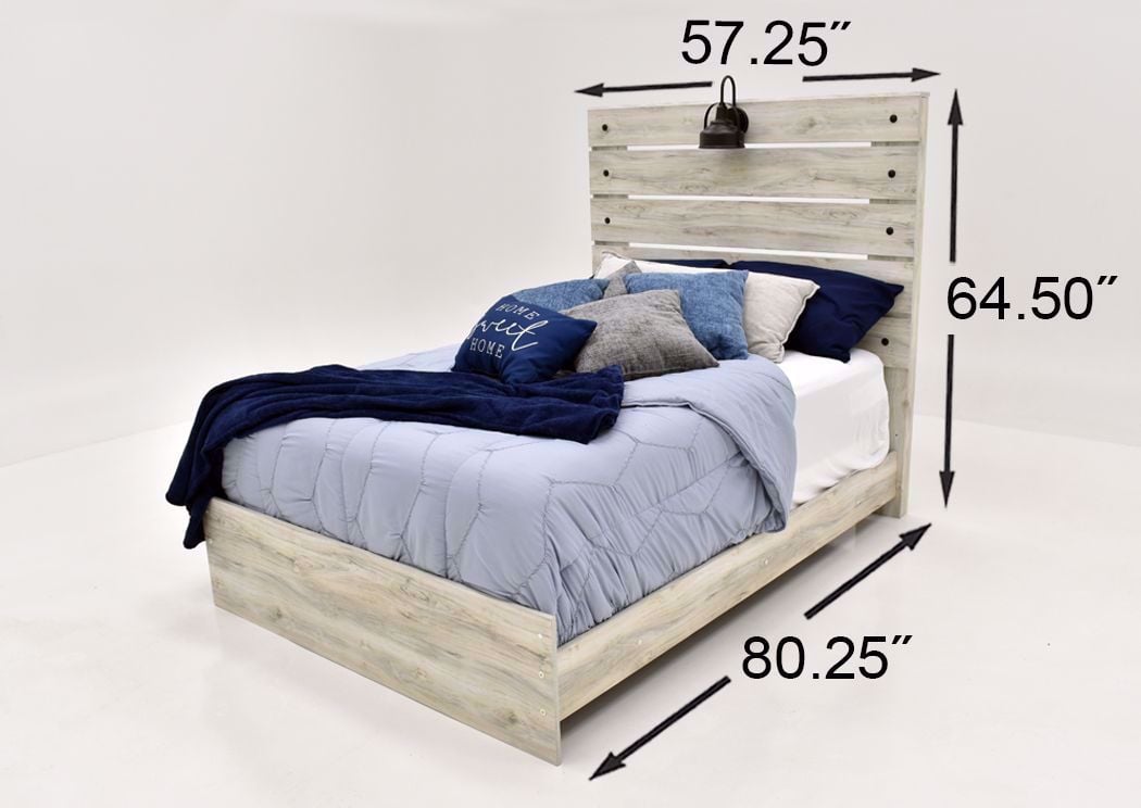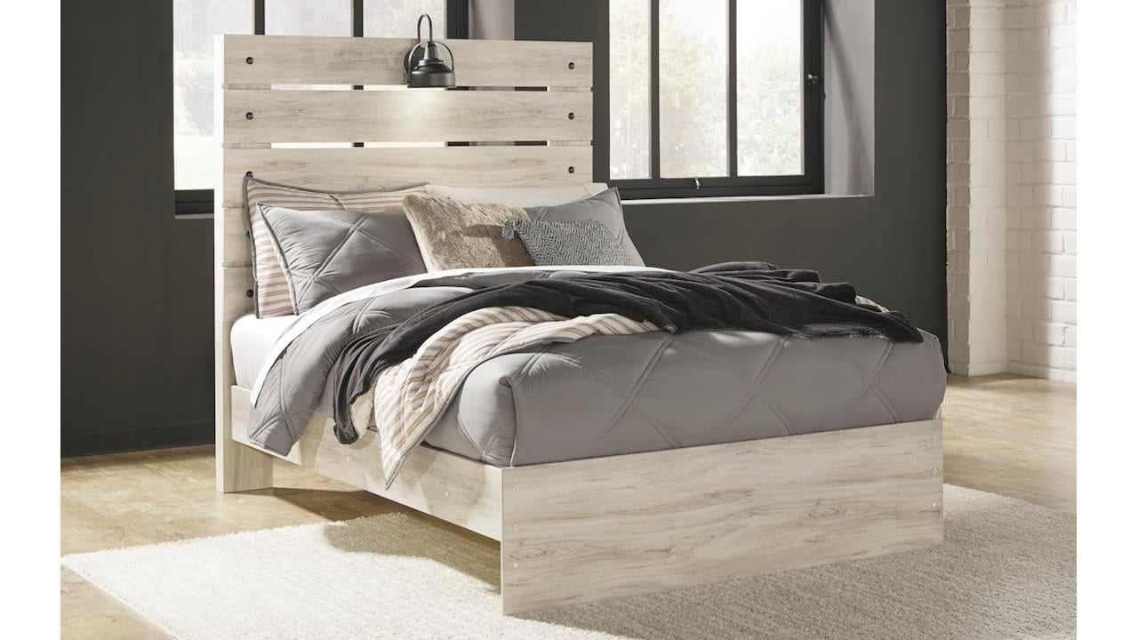 The Cambeck Full Size Bed has a fresh and clean design that will brighten any bedroom, including a children’s bedroom or a guest bedroom. The wispy white finish over a replicated oak grain adds a unique touch to the Cambeck Collection. This full size panel style and slatted headboard has a decorative black matte sconce lamp and is accented with similar black matte pegs.
