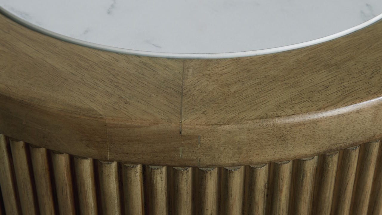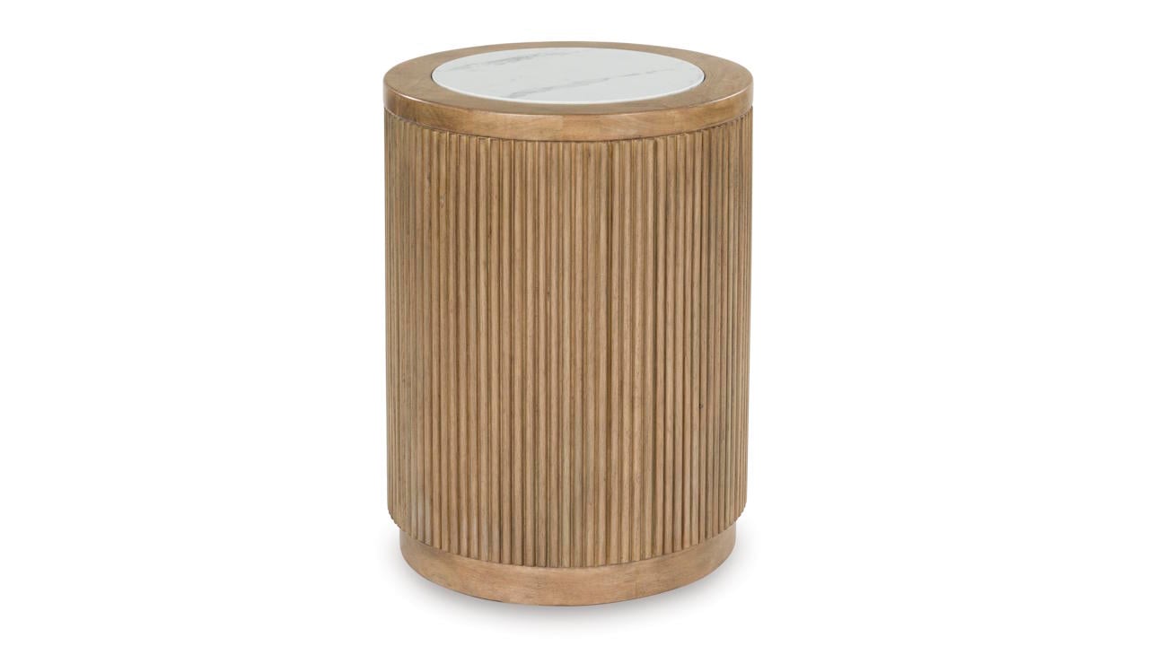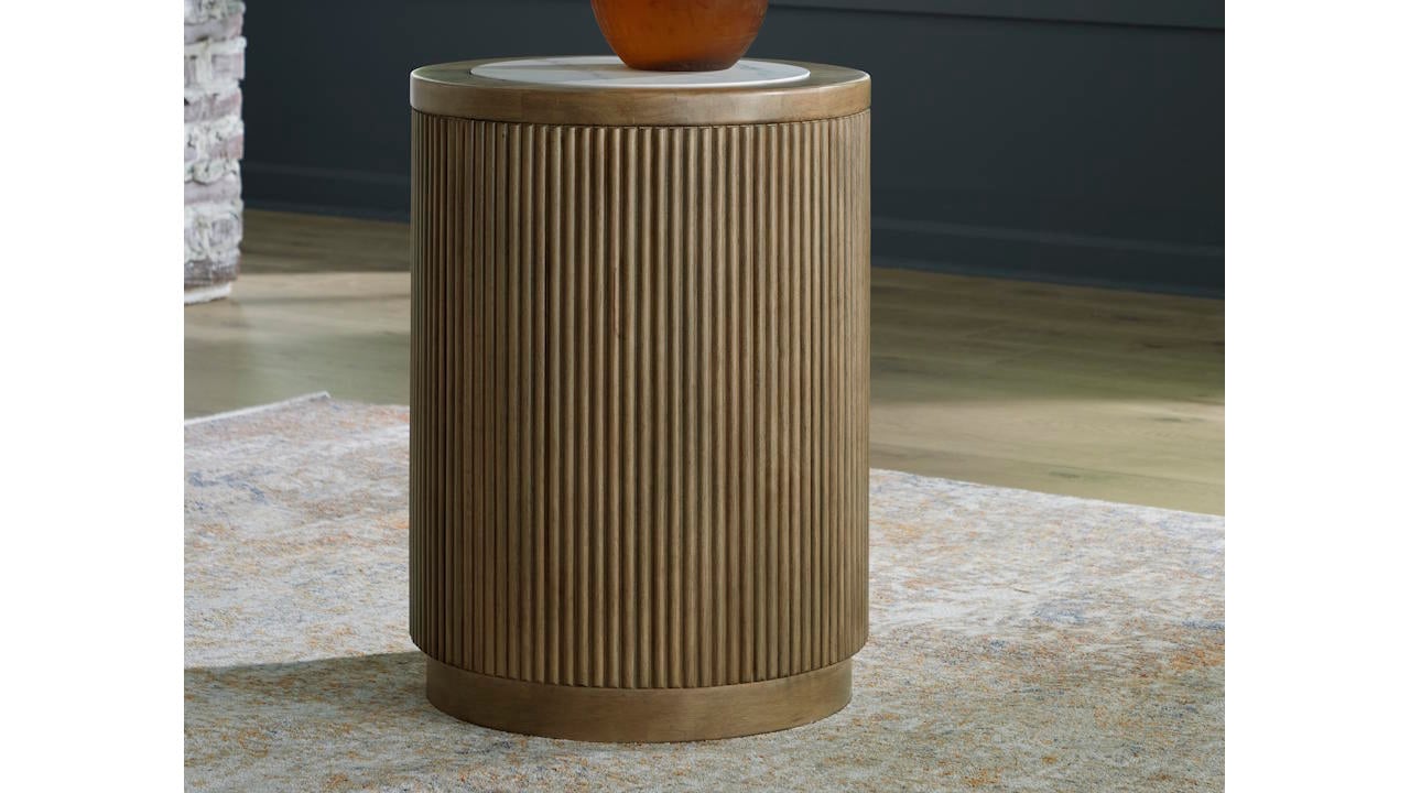 The Camdill End Table blends a faux marble top with a reeded base, offering stylish functionality with durable, easy-to-clean surfaces perfect for contemporary living spaces.
