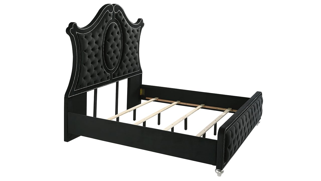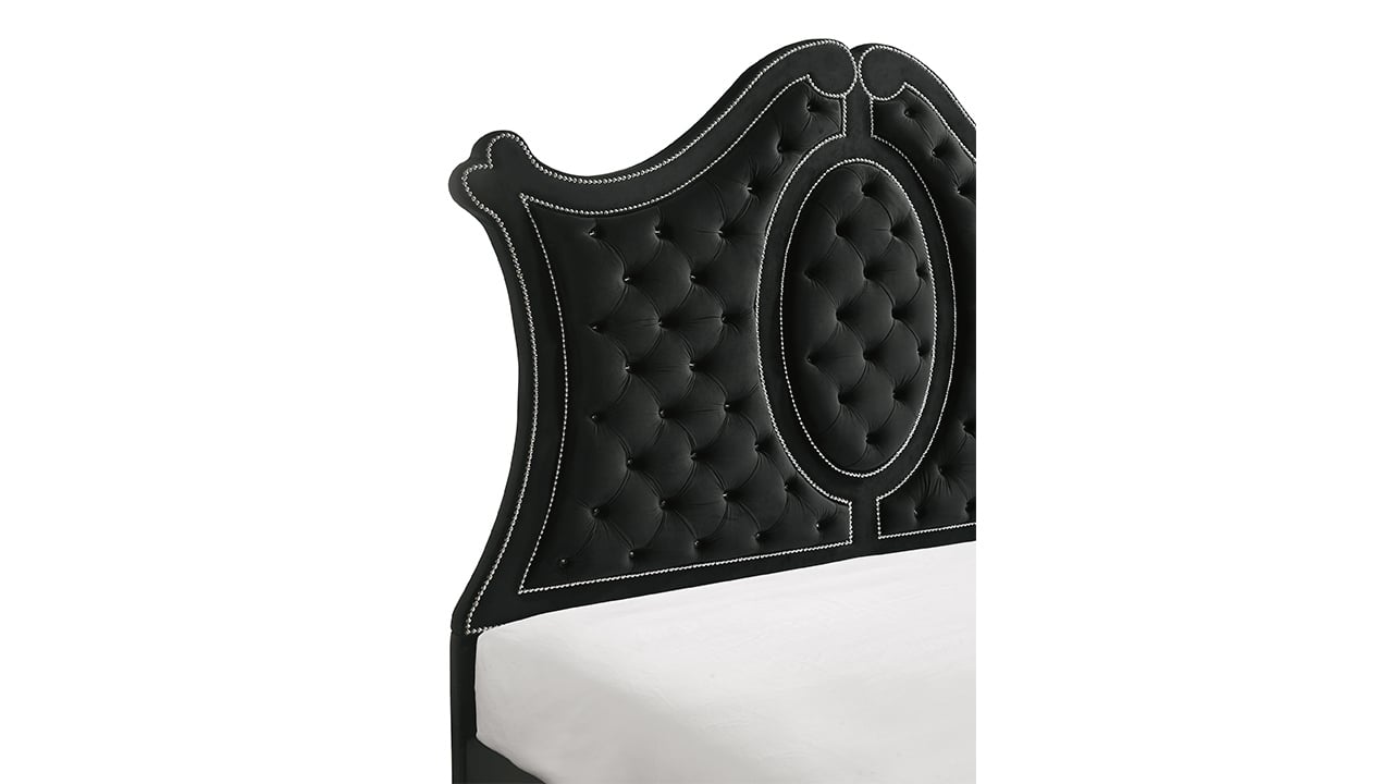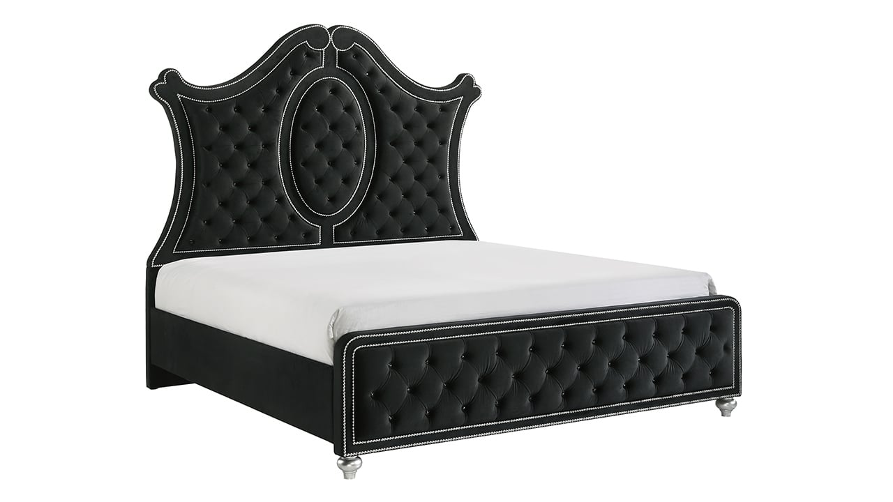 Bring bold elegance to your space with the Cameo Panel King Bedroom Group. Featuring a grand tufted headboard with nailhead trim and velvet-like upholstery, this set blends luxury with modern flair. Diamond-patterned fronts, crystal-style hardware, and a sleek black finish add drama, while spacious storage pieces offer everyday function. A perfect mix of comfort and sophistication.