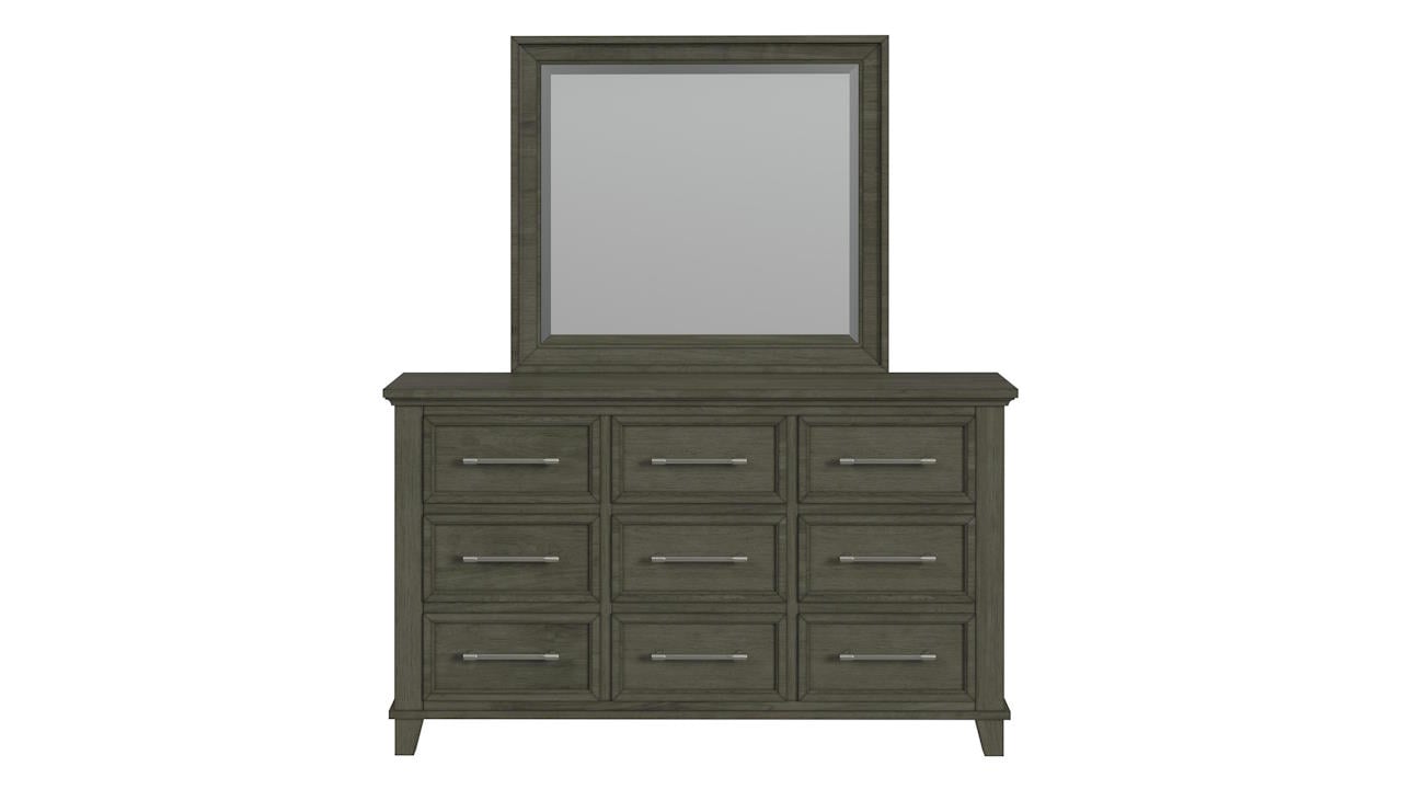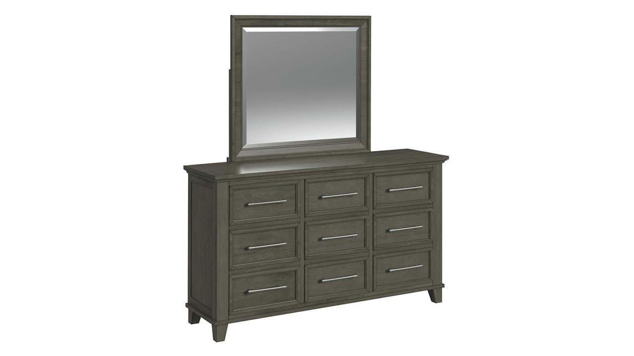The Canterbury Dresser with Mirror in Gray is a sleek, modern piece featuring nine drawers with silver handles, a matching framed mirror, and a cohesive gray finish, offering both style and functionality.