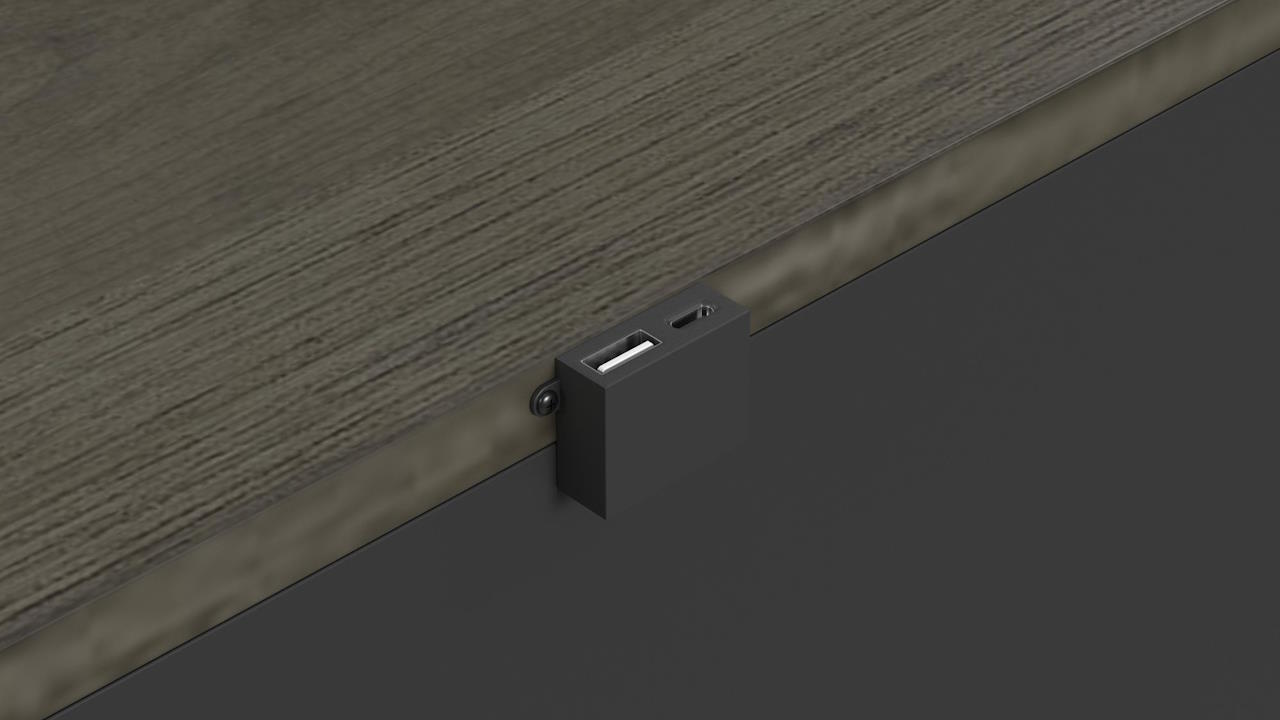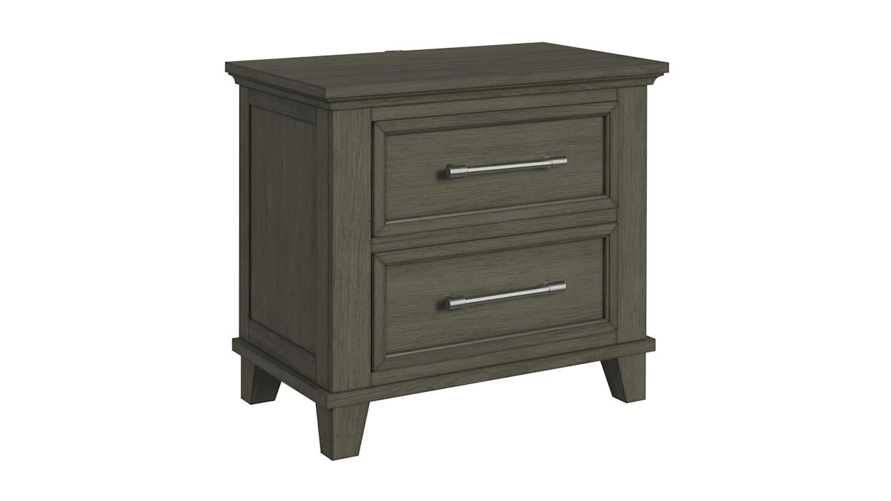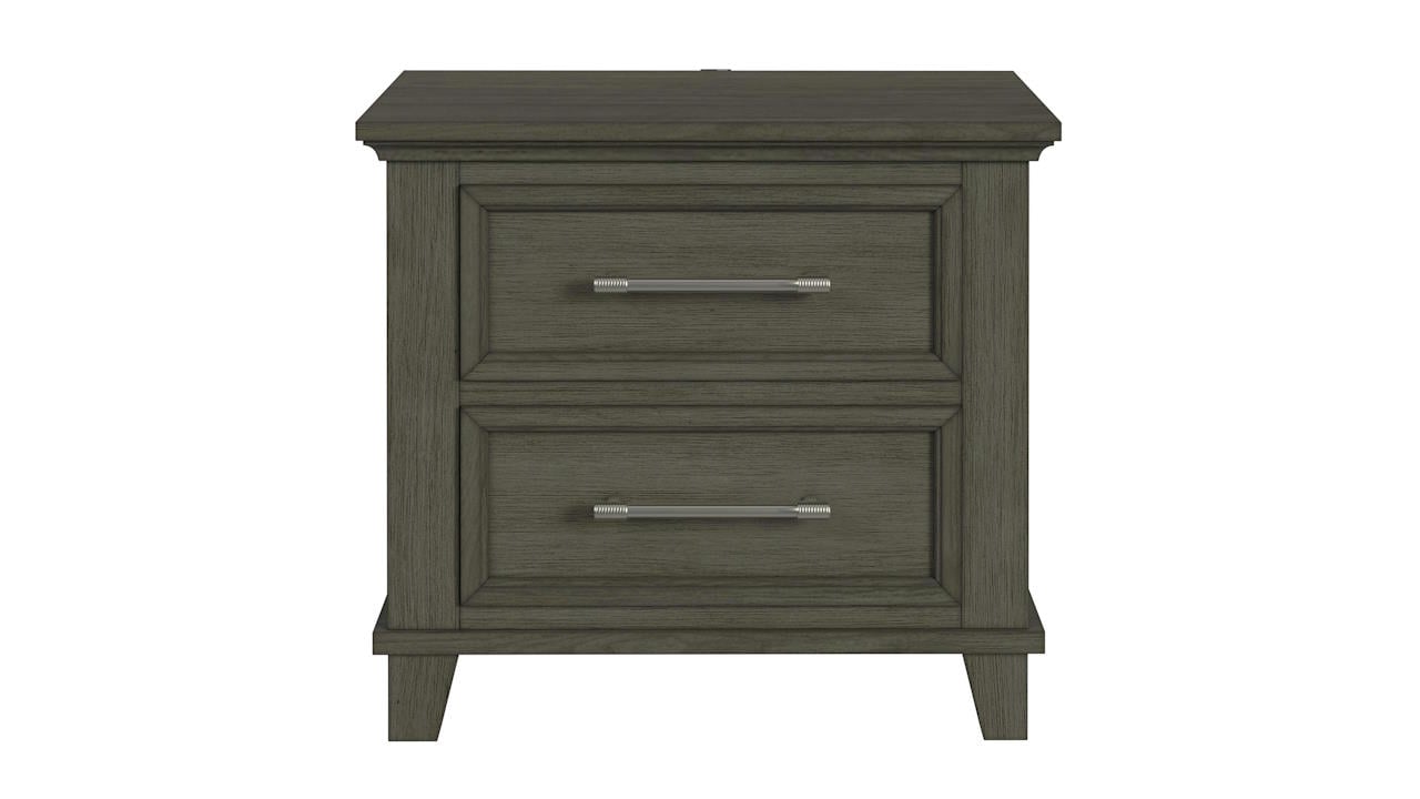 The Canterbury Nightstand in Gray features a sleek design with a spacious rectangular top, USB and USB-C charging ports, two panel-detailed drawers with elongated metal handles, and tapered legs, making it a stylish and functional addition to any bedroom.