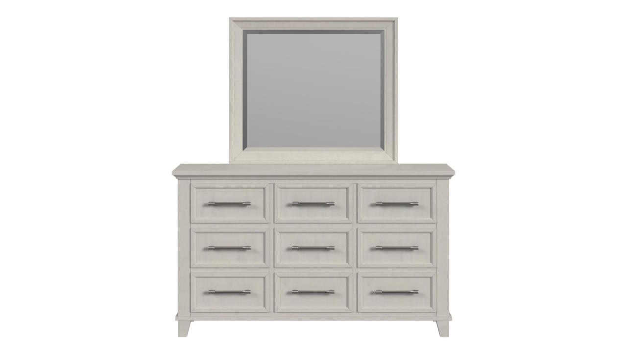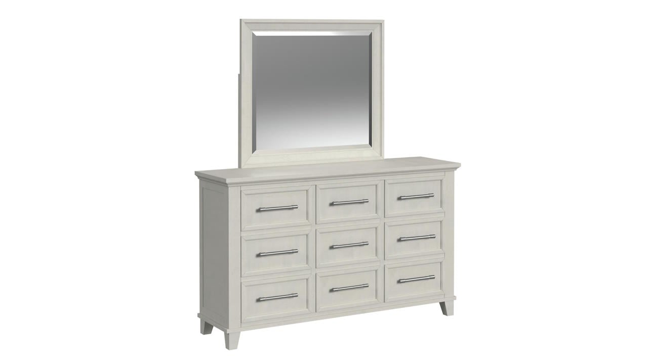 The Canterbury Dresser with Mirror in White is a sleek, nine-drawer piece with silver handles, standing on four legs, complemented by a matching framed mirror for a cohesive and elegant look.