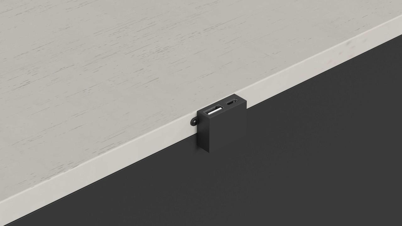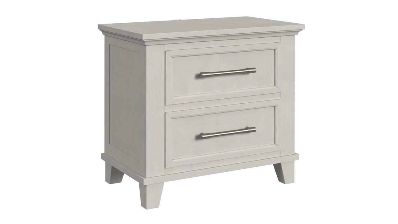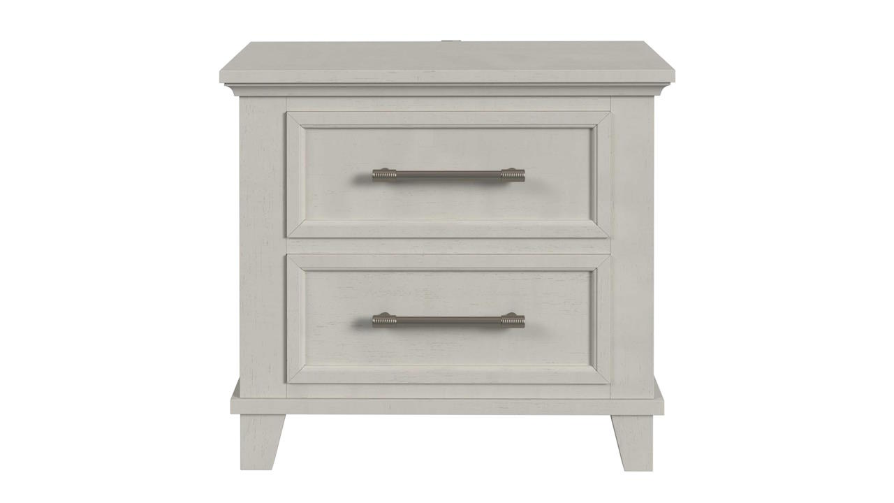 The Canterbury Nightstand in White features a sleek design with a spacious rectangular top, USB and USB-C charging ports, two textured drawers with elongated metal handles, and four sturdy tapered legs, making it a stylish and functional addition to any bedroom.