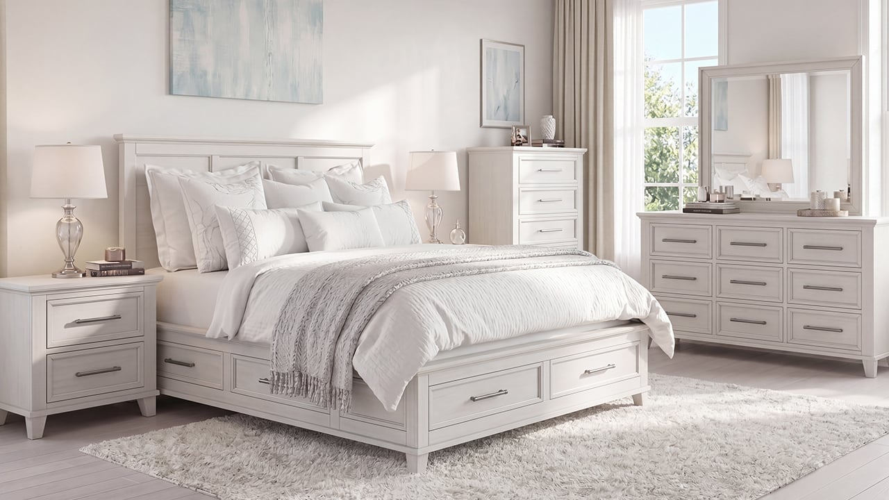 The Canterbury King Bedroom Set in White features a timeless design with a Queen Storage Bed offering six built-in drawers, a stylish dresser with nine spacious drawers and a matching mirror, and a nightstand that includes USB charging and ample surface space, making it an elegant and practical choice for any bedroom.