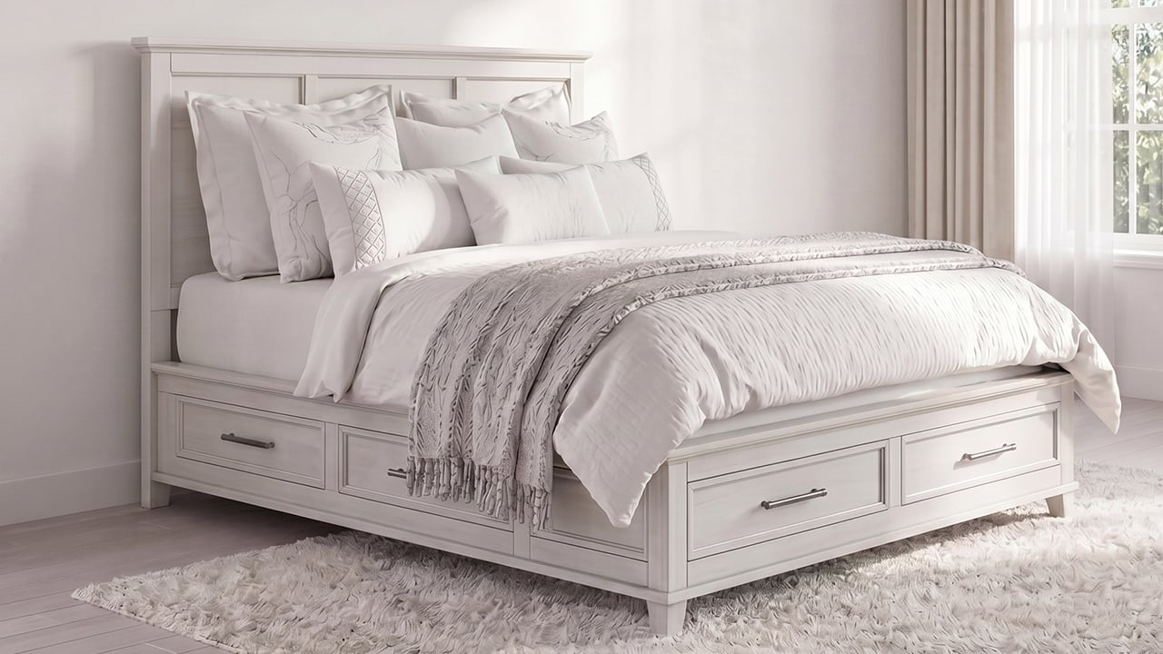 The Canterbury King Bedroom Set in White features a timeless design with a Queen Storage Bed offering six built-in drawers, a stylish dresser with nine spacious drawers and a matching mirror, and a nightstand that includes USB charging and ample surface space, making it an elegant and practical choice for any bedroom.