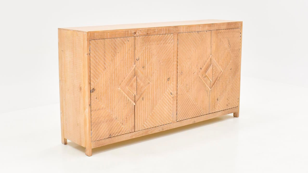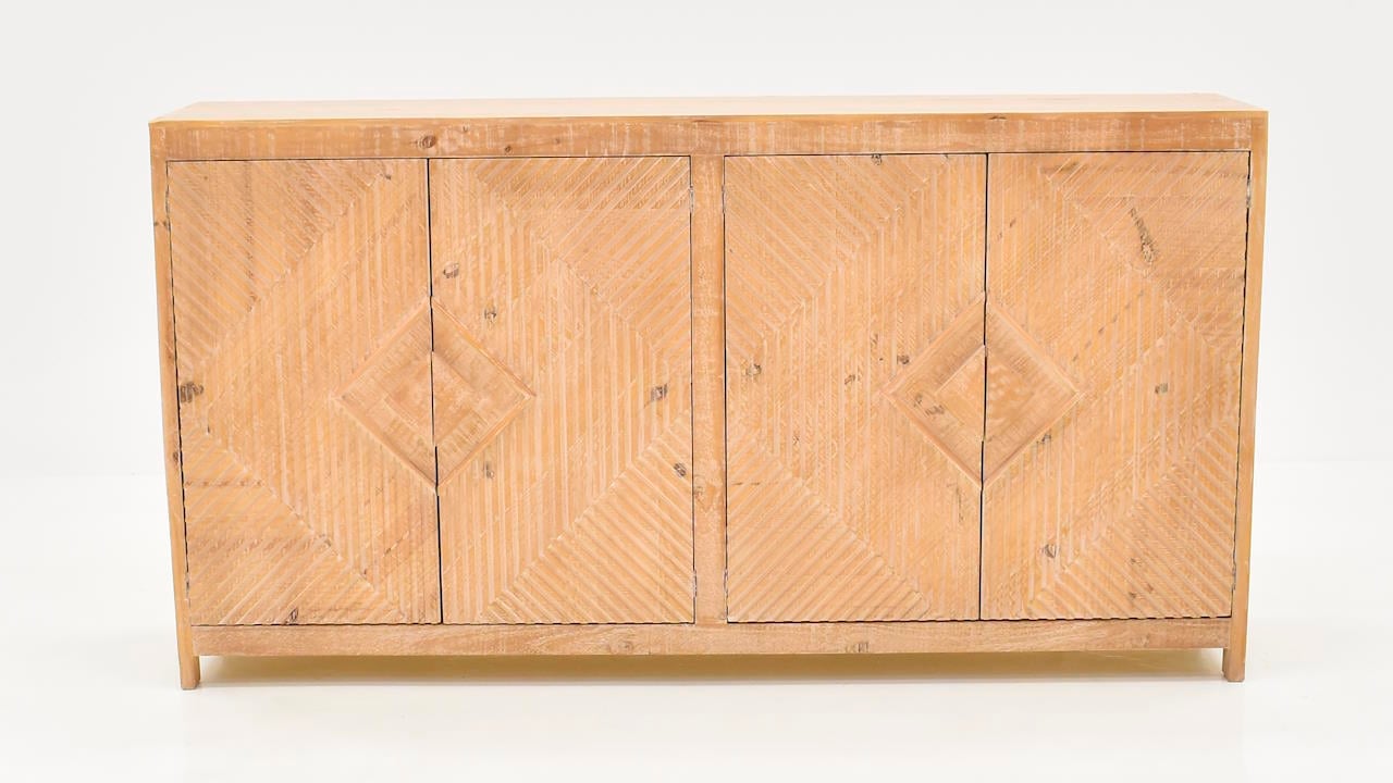 The Chandler 4-Door Console in Cappuccino is a beautifully crafted piece that combines functionality with rustic elegance. Featuring a warm cappuccino finish, this console highlights intricate geometric carvings across its front panels, including a striking central diamond motif surrounded by symmetrical, textured patterns. The clean, modern silhouette is complemented by slightly raised legs, offering a touch of lightness to its sturdy design. With four spacious doors, this console provides ample storage, making it a versatile addition to any living room, dining area, or entryway. Perfectly suited for farmhouse, coastal, or transitional interiors, the Chandler Console blends timeless charm with practical utility.