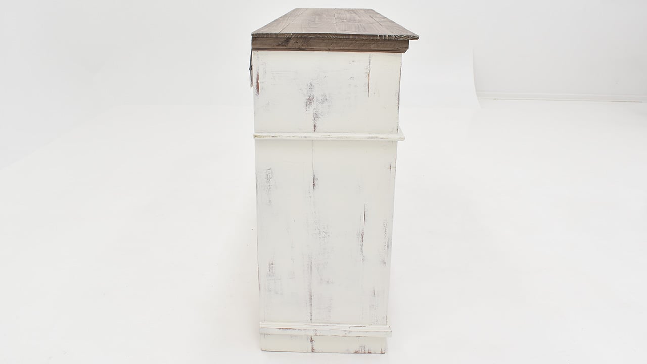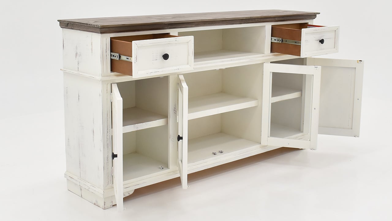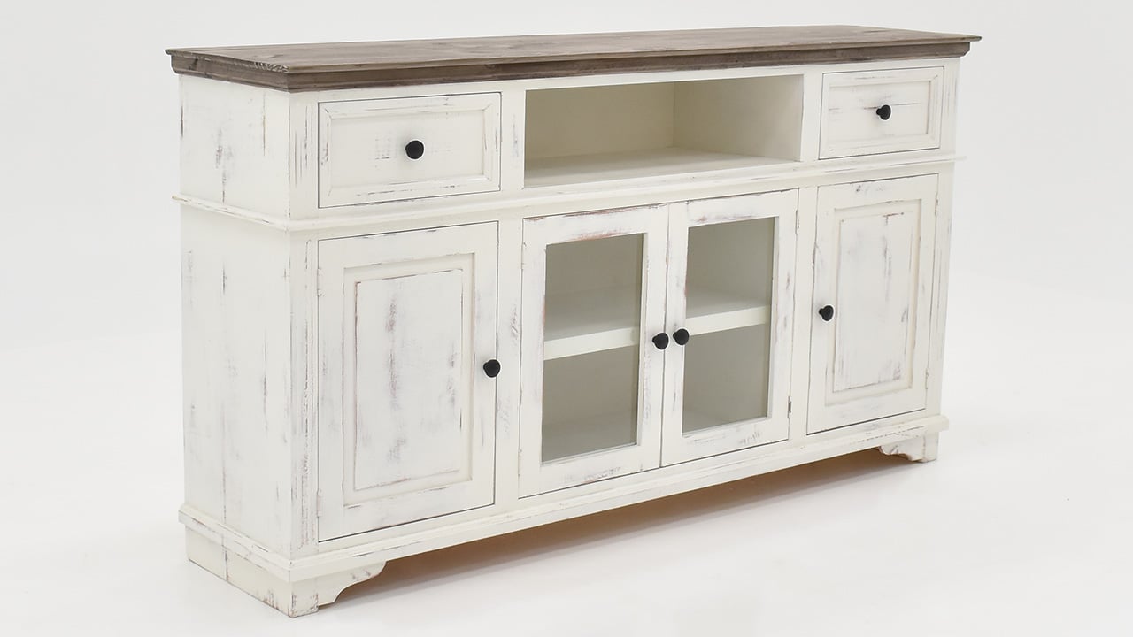 The rustic white finish on the Charleston TV Stand Console Cabinet has a gray finished top that adds a bit of style and will enrich any room in your home. The hand-applied finishes use a unique technique that will give your piece a one-of-a-kind look. The solid wood construction has clean lines, two drawers, open space, two solid doors on each end, and two framed glass doors in the center. The enclosed spaces feature a shelf for tons of easy and convenient storage options. Perfect for living room, dining room, or office.