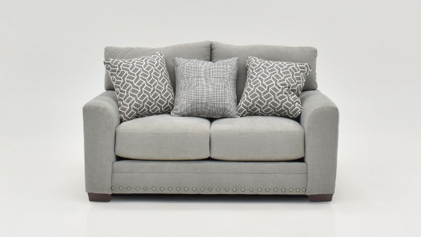 The contemporary farmhouse styling of the Cutler Loveseat brings comfort and style to your living room. Built for comfort, the seats are constructed of individually pocketed coils encased in foam and topped with a layer of cool gel-infused memory foam for a long-lasting, comfortable and supportive seat. Covered in a soft, durable 100% polyester body fabric in a light gray color and accented with coordinating designer toss pillows. The look is completed with pewter-finished nailhead accents along the base.  Proudly made in America.