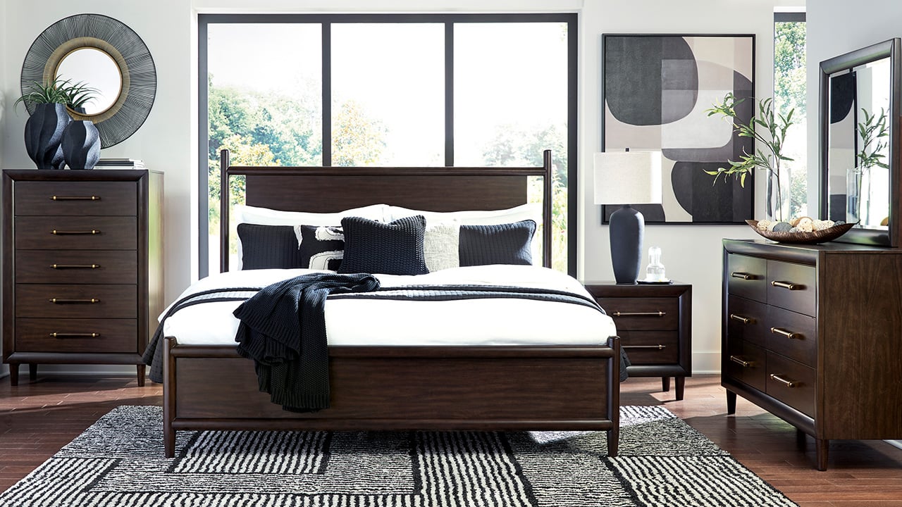 Create a stylish and comfortable bedroom retreat with the Dantenton King Bedroom Set. Designed with clean lines and gently rounded details, this set includes a king panel bed, dresser with mirror, and nightstand finished in a deep merlot tone. Spacious storage, felt-lined drawers, and convenient bedside USB charging combine modern functionality with timeless style.