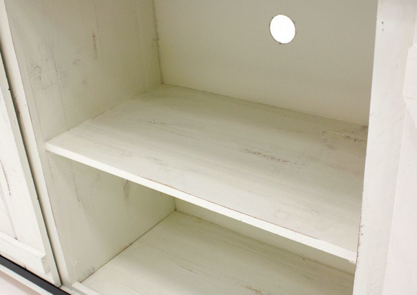 Add a rustic and trendy style to your home or office with the beautiful Diego 60 Inch TV Stand by Vintage Furniture. You'll love the durable solid wood construction with the distressed white finish and the decorative wrought iron hardware! The brown barn-style sliding doors open to reveal roomy shelves for storing all your electronic media.