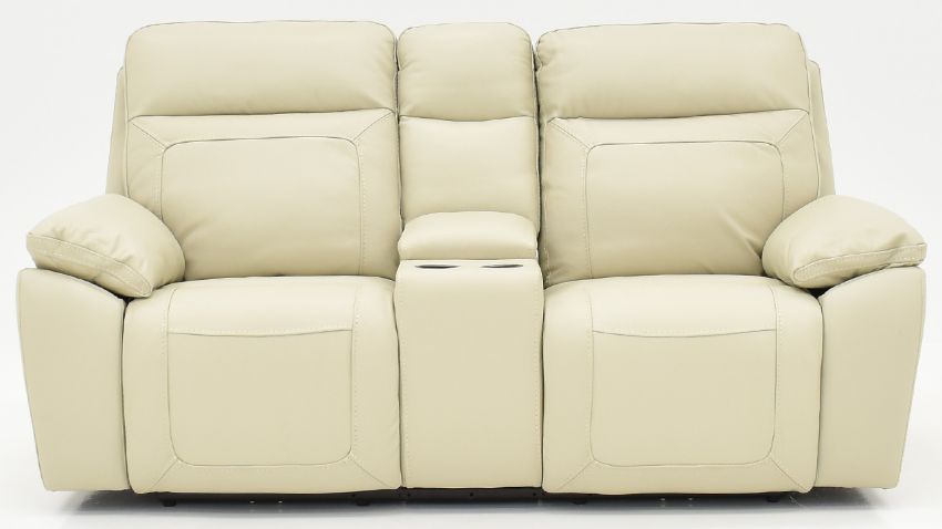 Off-White POWER Leather Reclining Loveseat. Leather Upholstery. Adjustable Headrests. Storage Console. Cup Holders.
