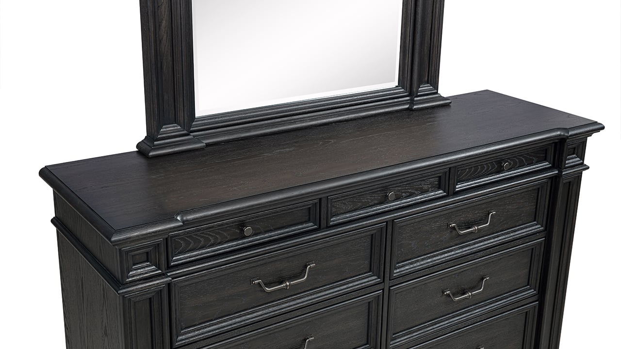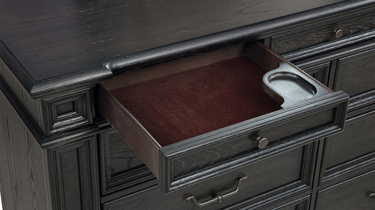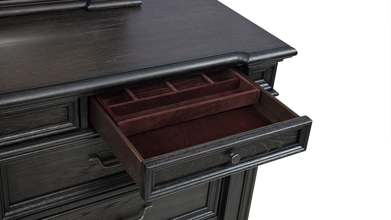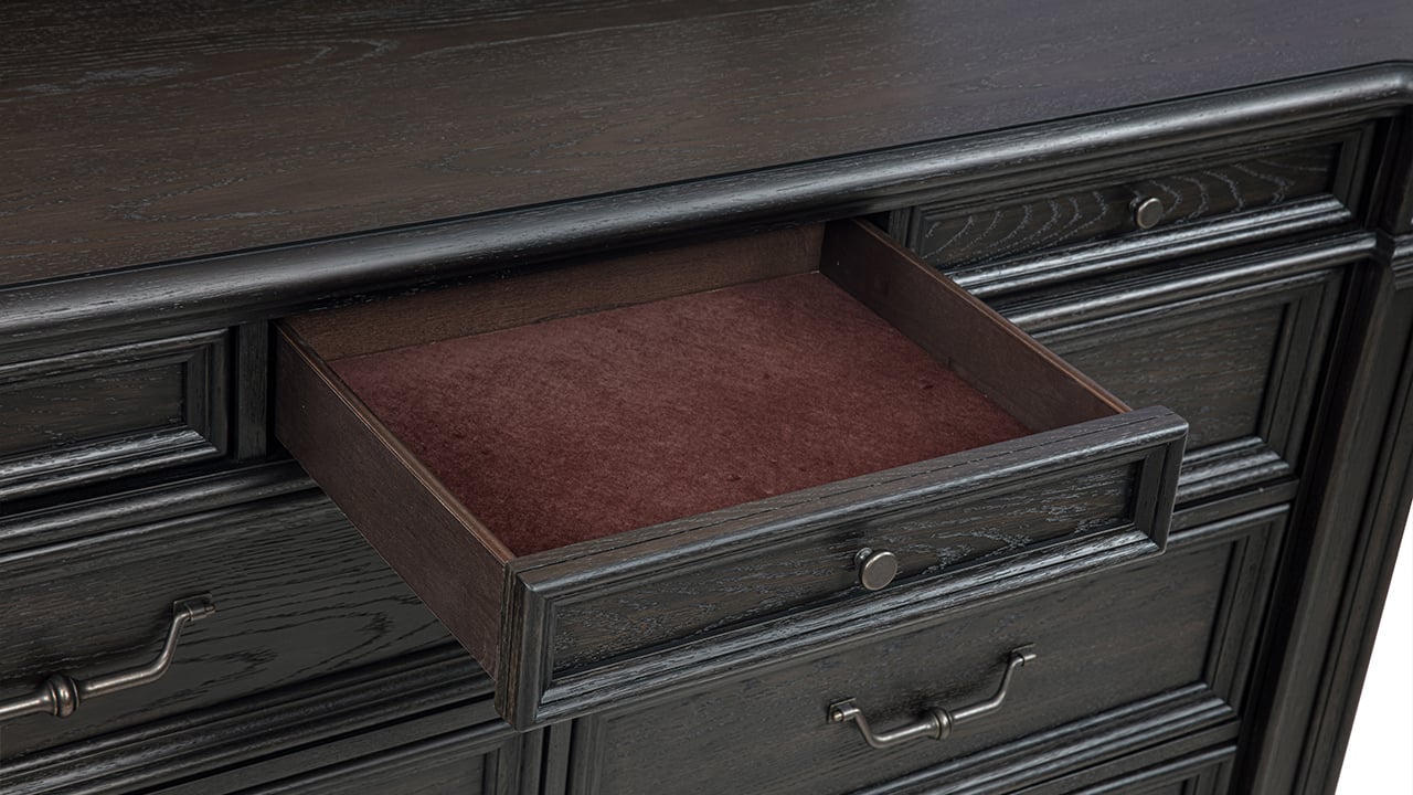 Elevate your space with the stately presence of the Dresden King Storage Bedroom Set. Designed with a rich dark brown English oak finish and timeless traditional styling, this collection delivers both sophistication and smart functionality. With generous storage, upholstered detailing, and modern tech features, it creates a luxurious and highly functional bedroom retreat.