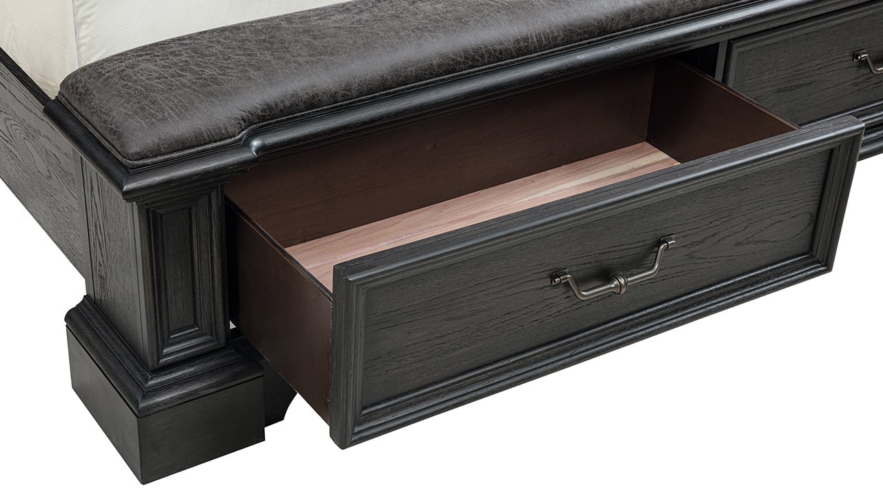 Elevate your space with the stately presence of the Dresden King Storage Bedroom Set. Designed with a rich dark brown English oak finish and timeless traditional styling, this collection delivers both sophistication and smart functionality. With generous storage, upholstered detailing, and modern tech features, it creates a luxurious and highly functional bedroom retreat.