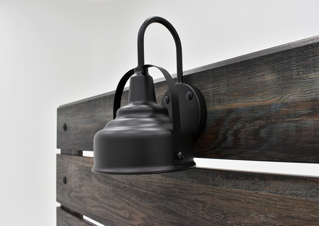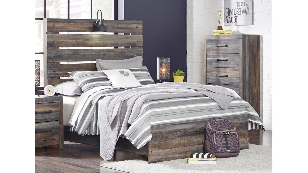 The Drystan Full Size Bed has a trendy and stylish design that will complete any bedroom whether it’s a primary bedroom, children’s bedroom, or a guest bedroom. The rustic barn wood brown finish over a replicated oak grain adds a unique touch to the Drystan bed. This full size slatted headboard has a decorative black matte sconce lamp and is accented with similar black matte pegs.
