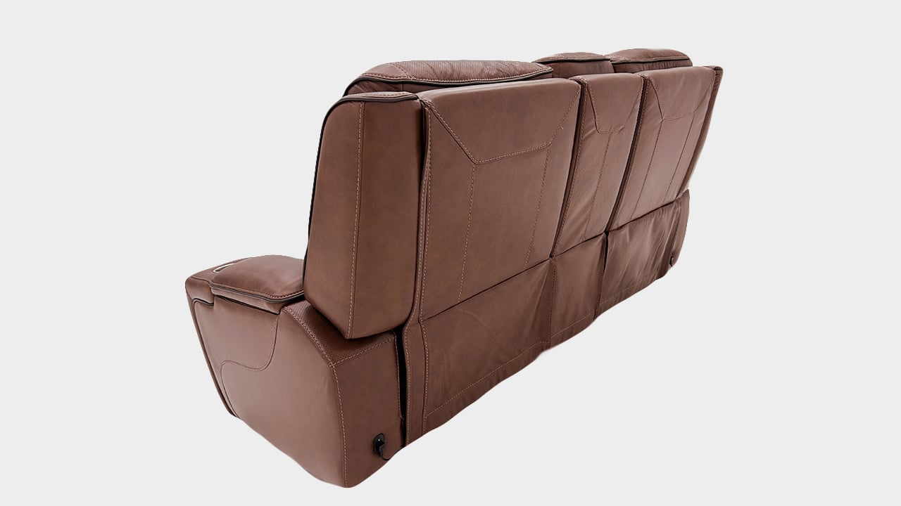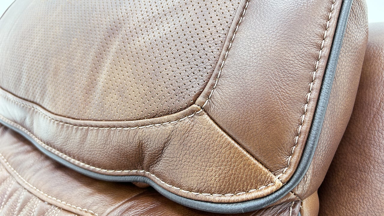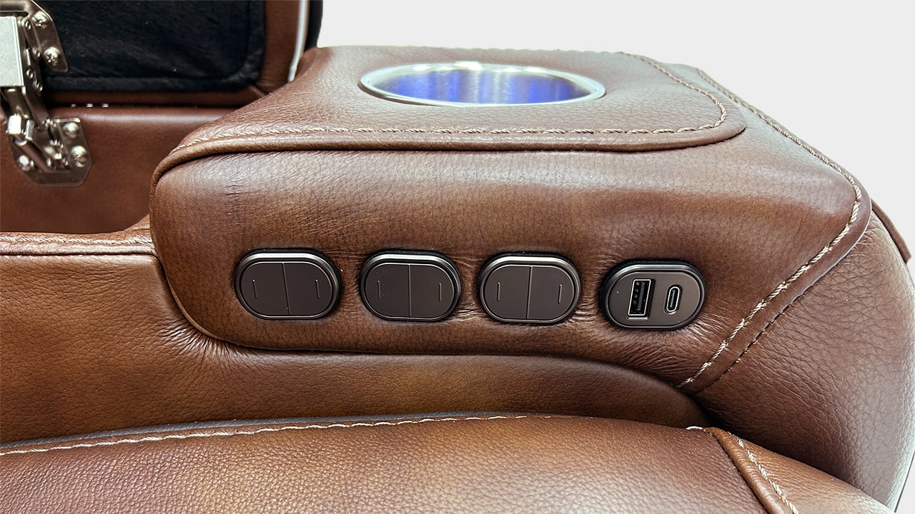 Brown power leather upholstery with black piping