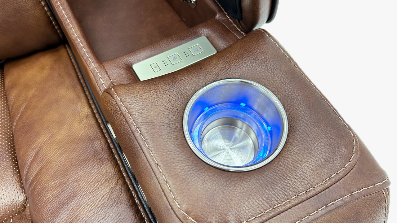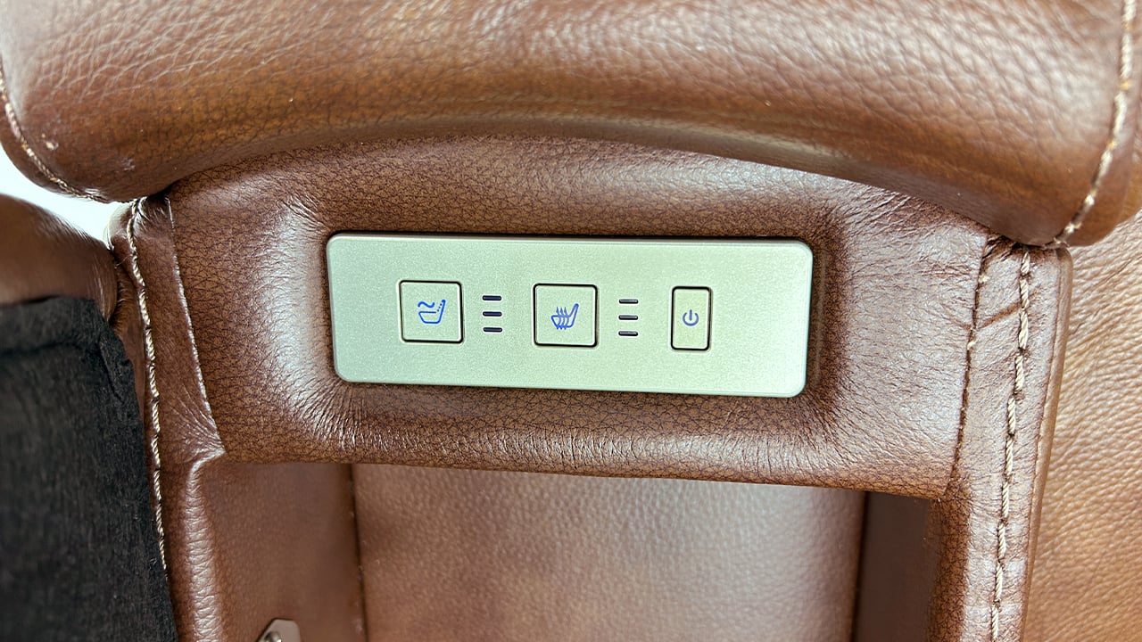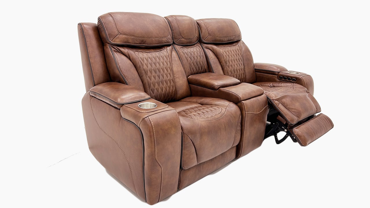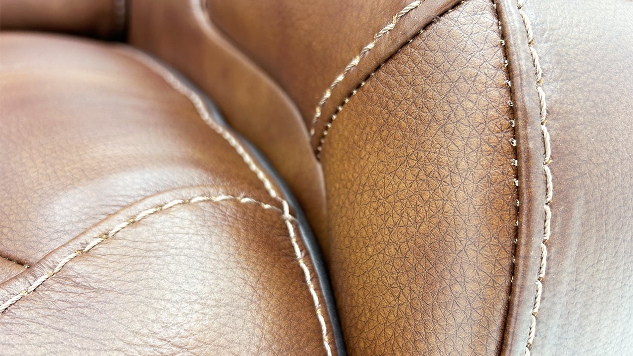 Brown power leather upholstery with black piping