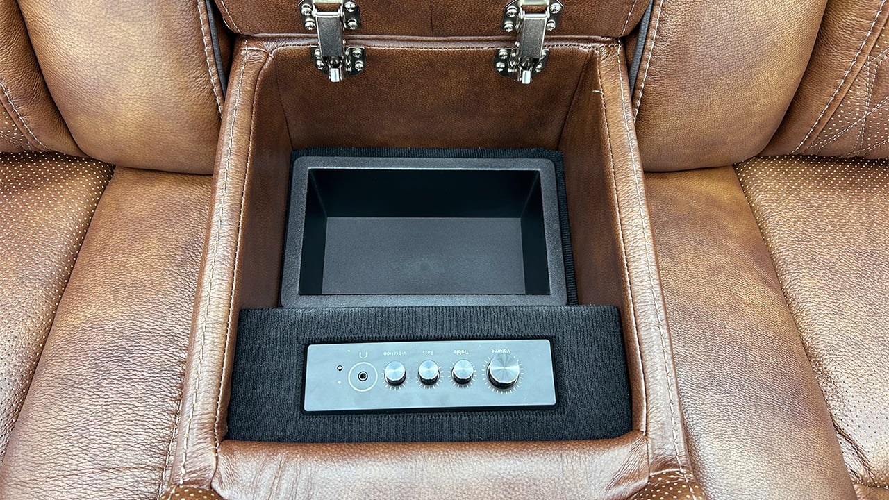 Integrated audio system with speakers built into the headrest of each reclining piece